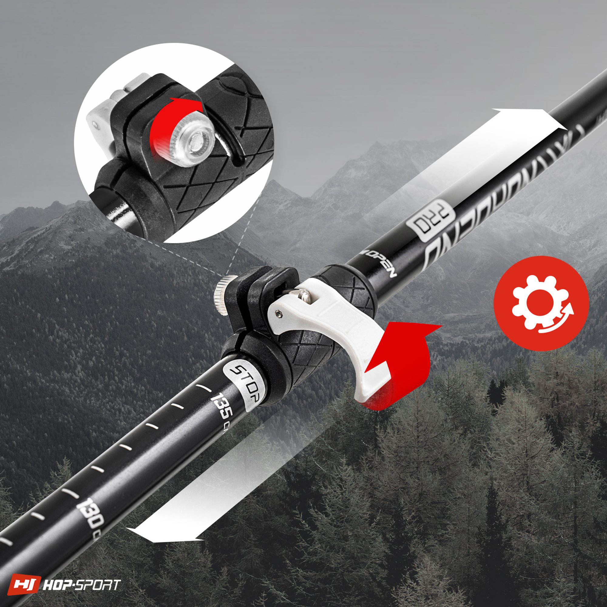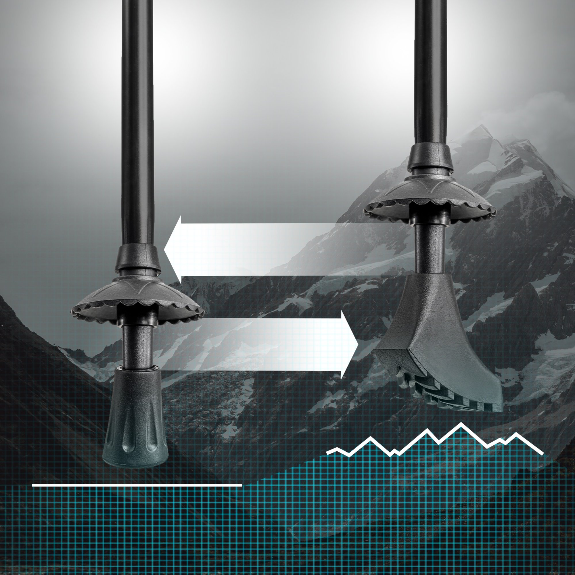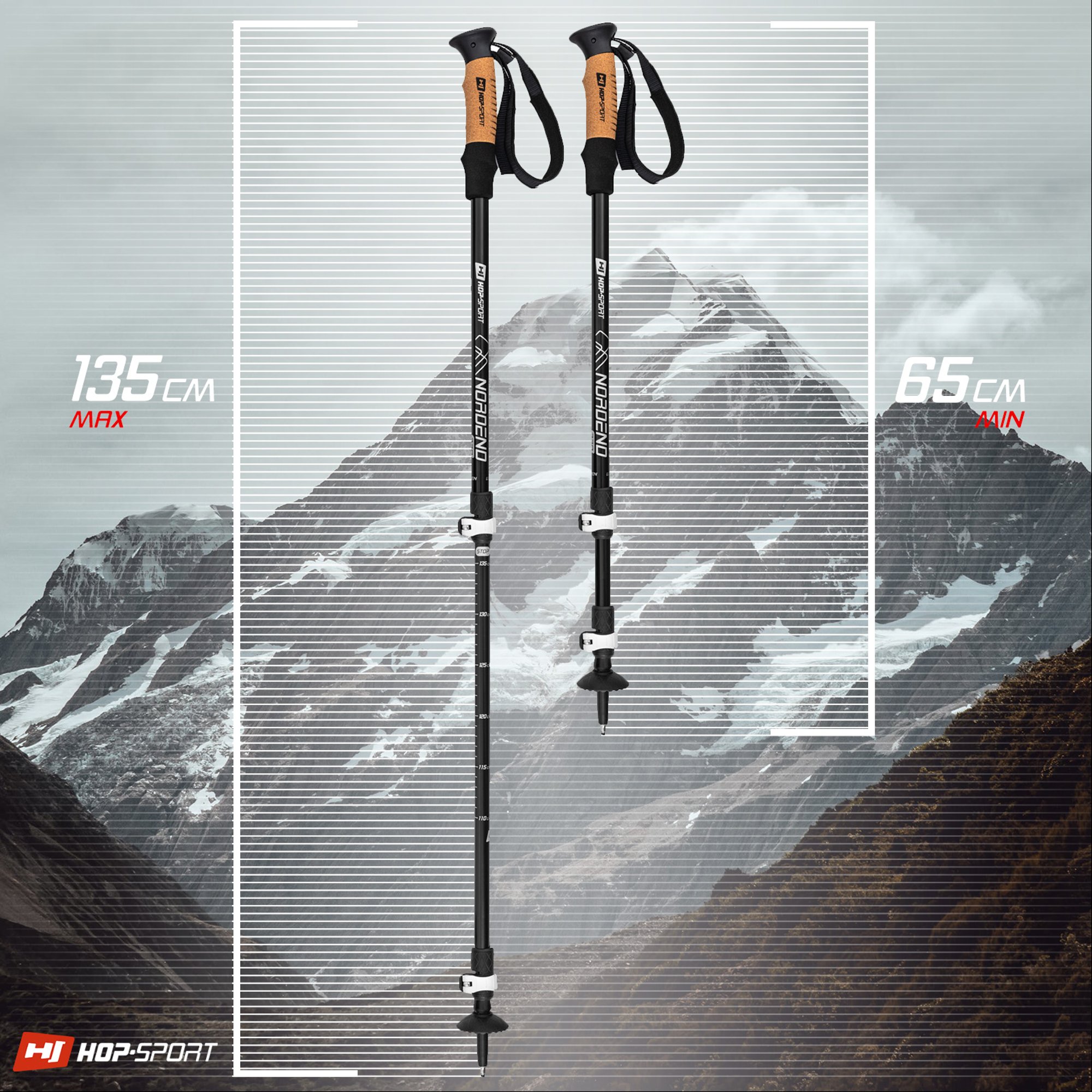 Grazie alla struttura telescopica, la lunghezza dei bastoncini può essere regolata liberamente in base all'altezza dell'utente o al percorso scelto. La scala molto leggibile e il sistema di bloccaggio della lunghezza del bastoncino, realizzato con precisione, rendono l'adattamento delle loro dimensioni estremamente semplice.