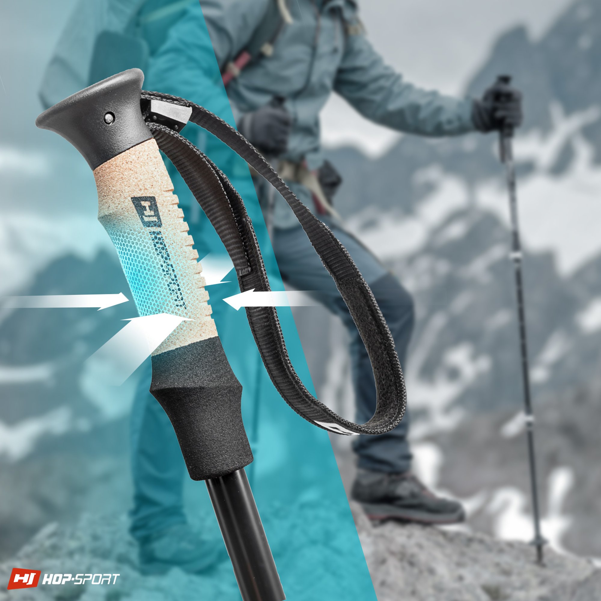 I bastoncini sono dotati di impugnature sagomate in sughero. Il sughero assorbe l'umidità e il sudore, e la sua struttura garantisce una buona presa sulla mano. All'impugnatura è fissato un laccio speciale. Facilita l'uso dei bastoncini durante la camminata, previene la loro perdita, aumenta la sicurezza e consente un facile trasporto. Le coperture incluse nel set per le punte dei bastoncini consentono di allenarsi in diverse condizioni.