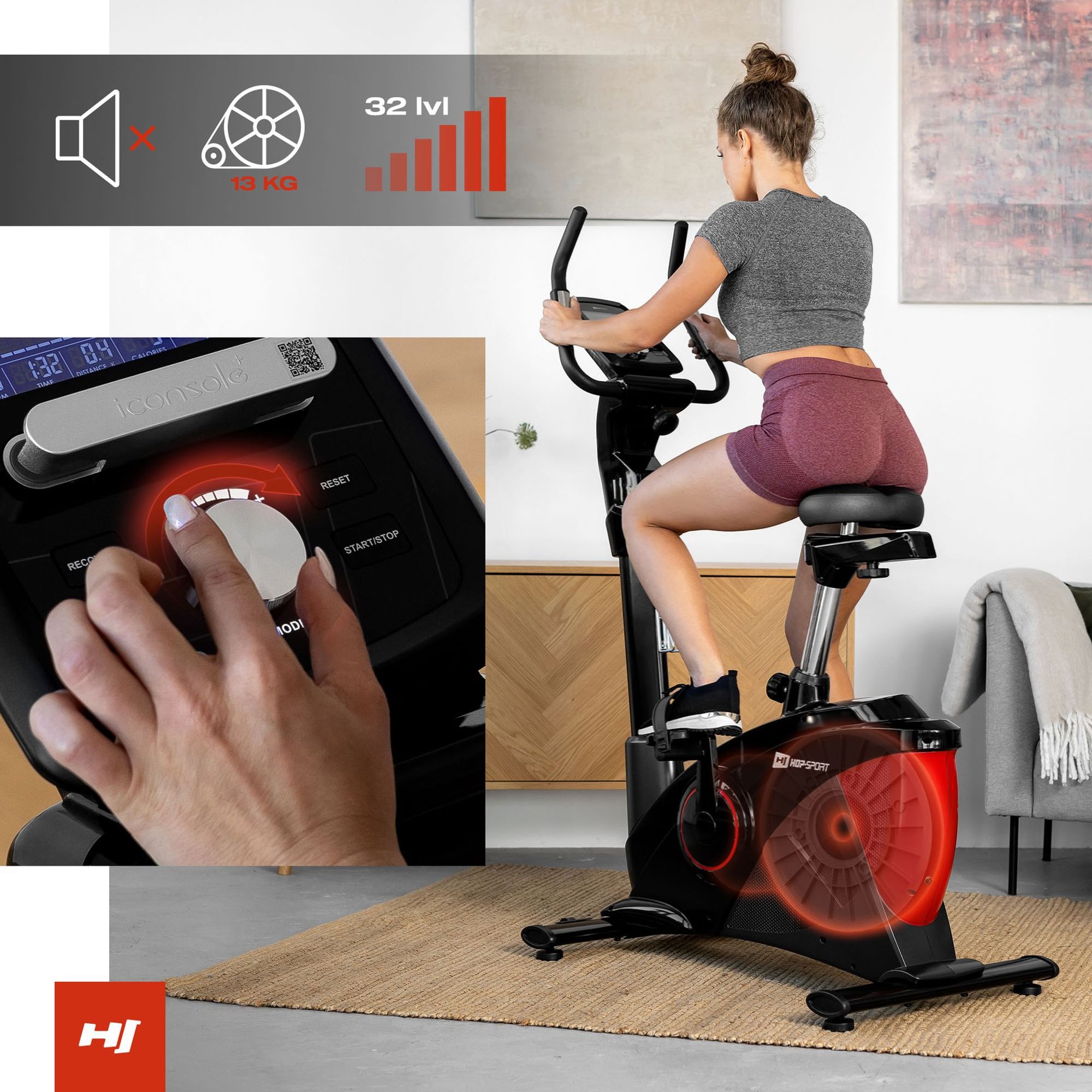 Bicicletta stazionaria elettrica HS-090H Apollo con sistema di resistenza magnetica controllato elettronicamente, dotata di computer con programmi di allenamento e misurazione, e possibilità di connessione tramite Bluetooth alle applicazioni iConsole+training e Kinomap. Allenati con Hop-Sport e la nostra cyclette compatta per piccoli spazi e silenziosa per appartamento!