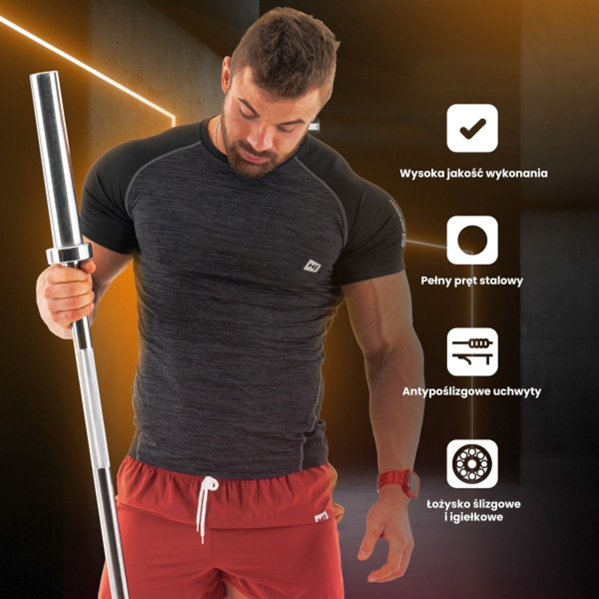 Le dimensioni del bilanciere sono state adattate in modo che tu possa utilizzarlo comodamente e in sicurezza. È ideale per manubri olimpici, e con il suo aiuto puoi eseguire remate, squat e press con carichi variabili.