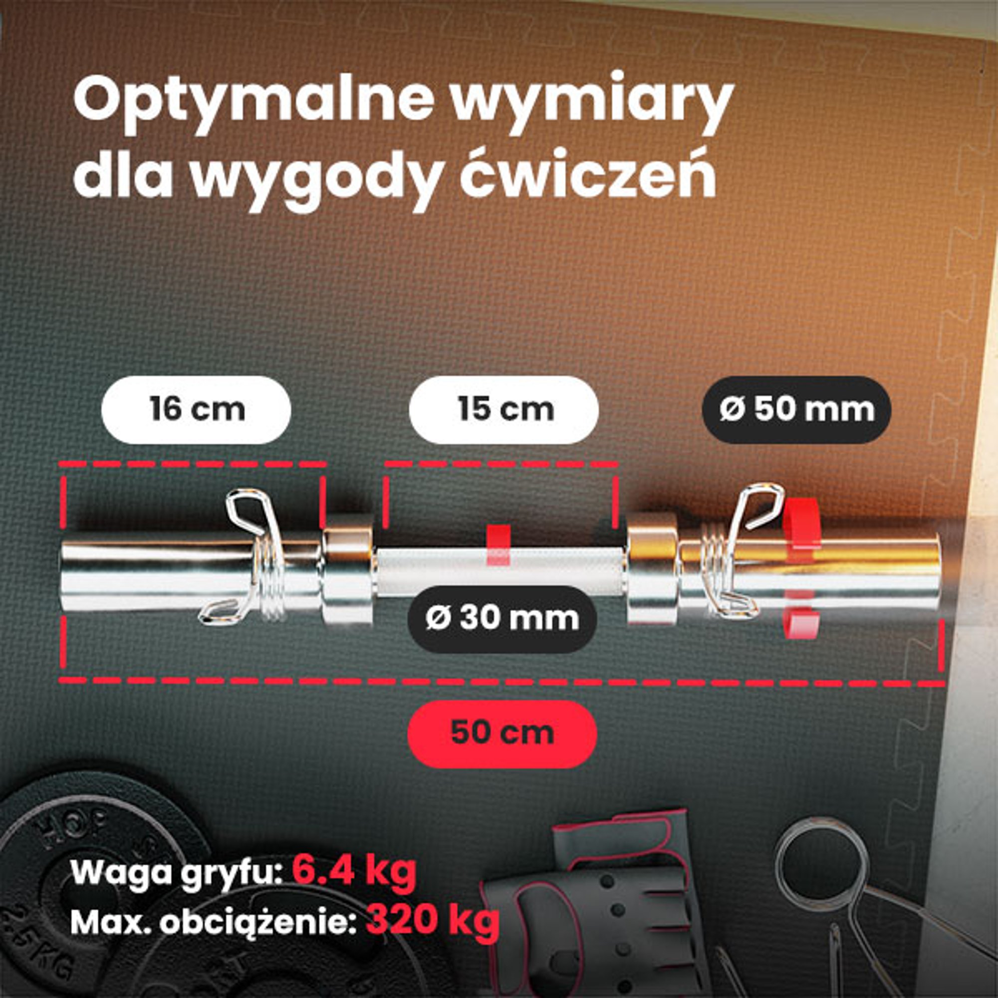 Bilanciere olimpico 50 cm è un'attrezzatura progettata per un allenamento di forza intensivo con carichi pesanti. Lo spessore del bilanciere olimpico rispetto ai bilancieri standard è maggiore del 40%, il che si traduce in una maggiore capacità di carico - fino a 320 kg. Il bilanciere di 50 cm è ideale per l'allenamento con manubri coinvolgendo, tra gli altri, i muscoli delle braccia, delle spalle e della schiena. La parte di presa zigrinata con un diametro di 30 mm garantisce una presa sicura, influenzando direttamente la sicurezza dell'esercitante. I cuscinetti a strisciamento e ad aghi garantiscono comfort e fluidità nell'allenamento. Al prodotto sono inclusi speciali morsetti a molla, che comprimono i dischi olimpici sulla barra e prevengono lo scivolamento accidentale dei pesi durante esercizi intensi.