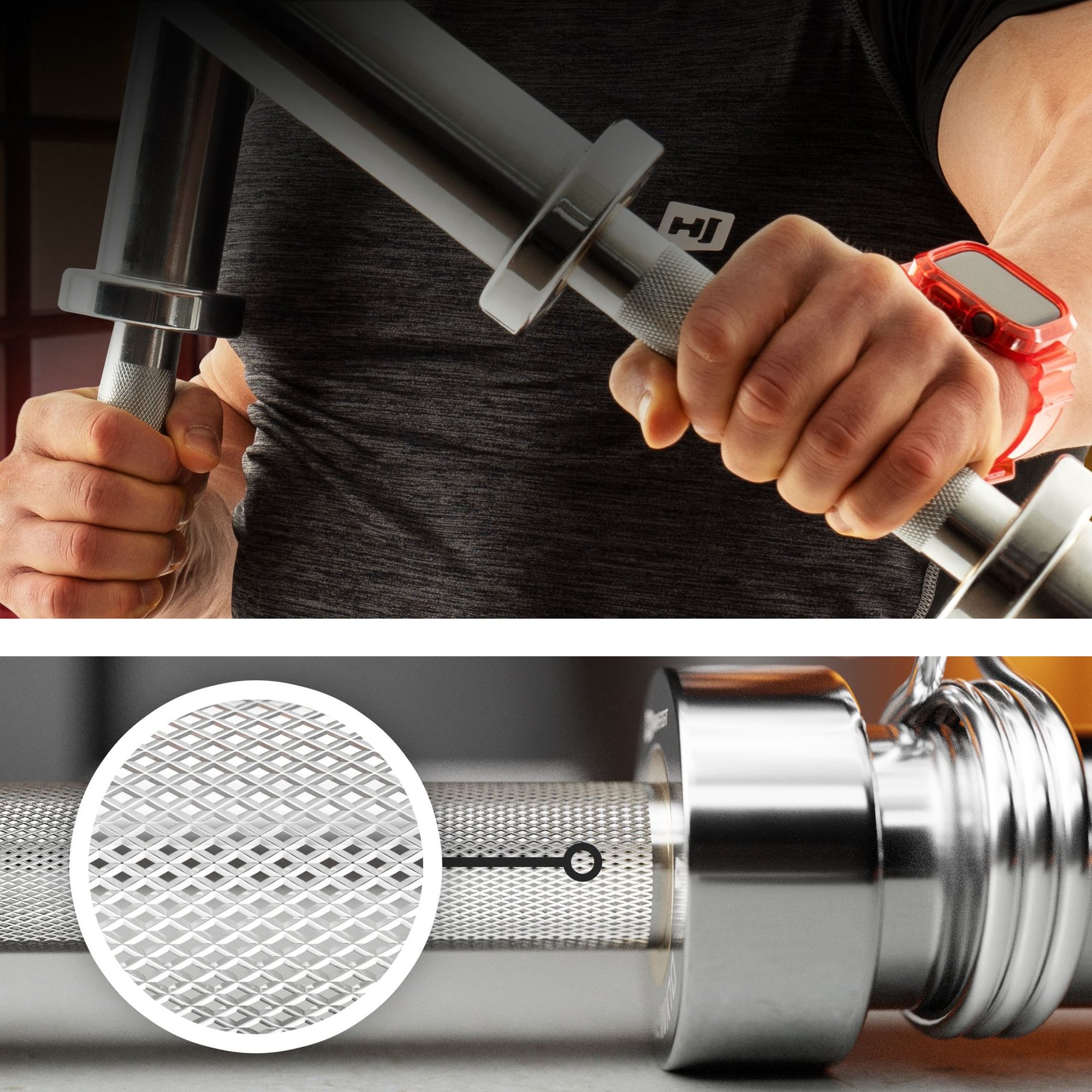 Con il bilanciere olimpico puoi sollevare pesi in sicurezza grazie alla parte di presa zigrinata, che possiede proprietà antiscivolo e assicura una presa sicura anche in caso di mani scivolose.