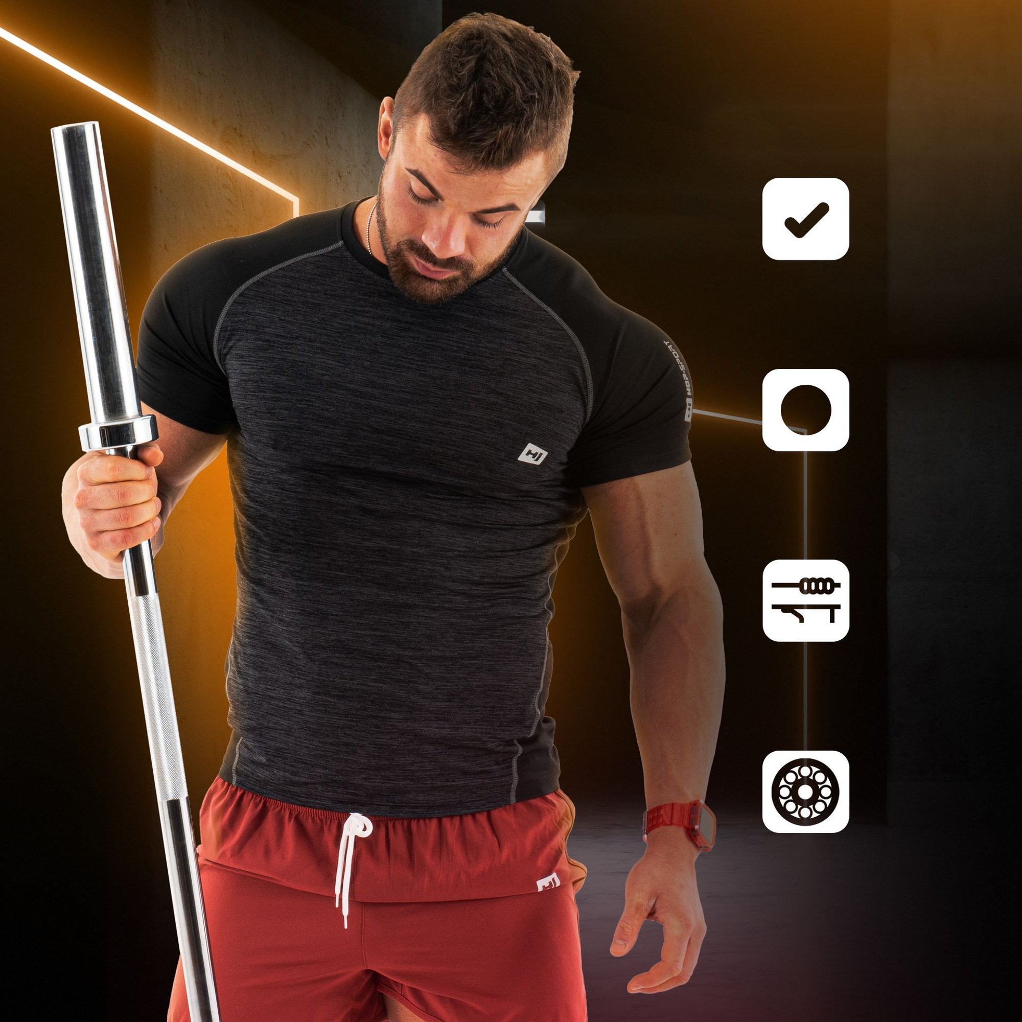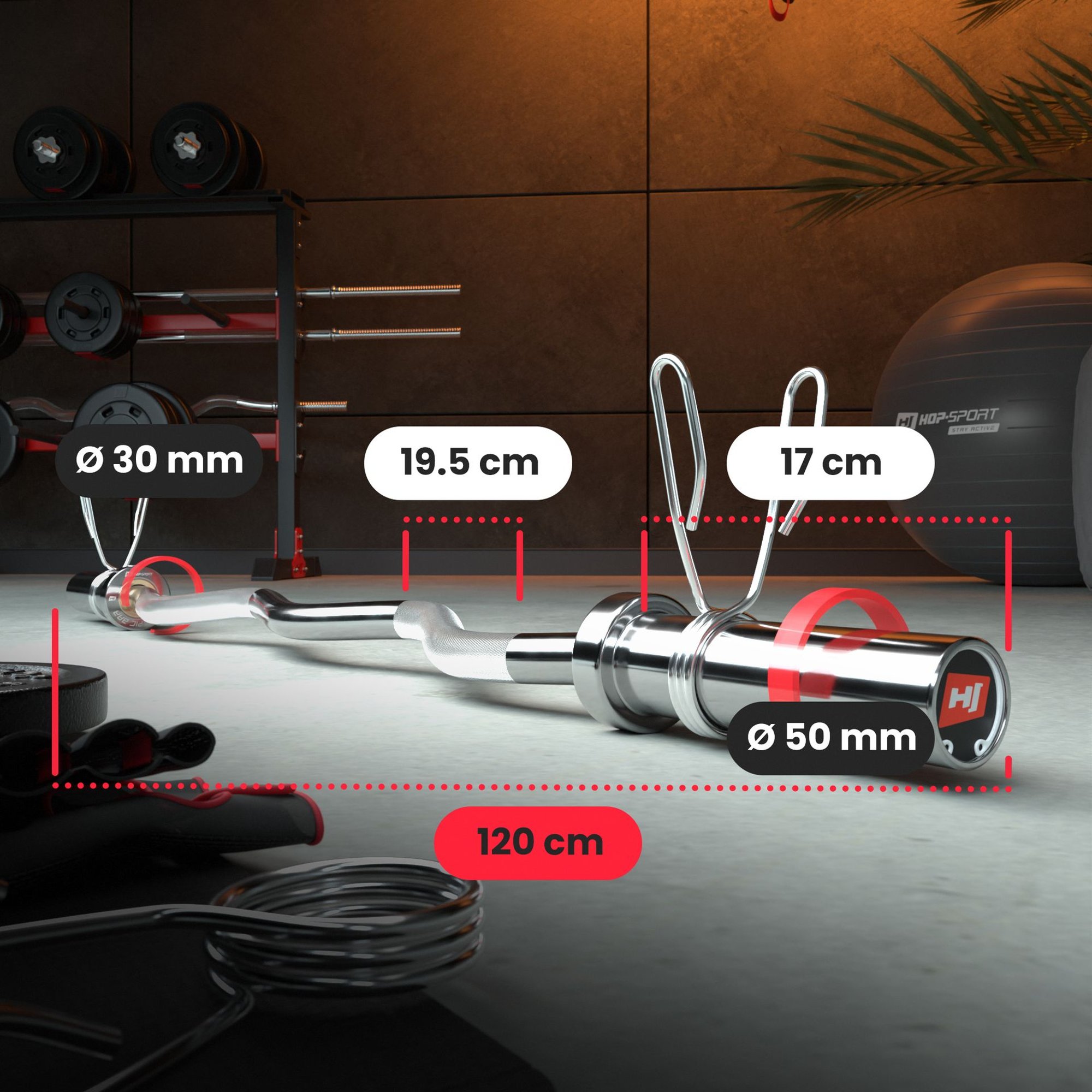 Bilanciere olimpico 120cm leggermente curvo con diametro di 50mm. Dotato di impugnatura antiscivolo e terminali filettati per un allenamento sicuro