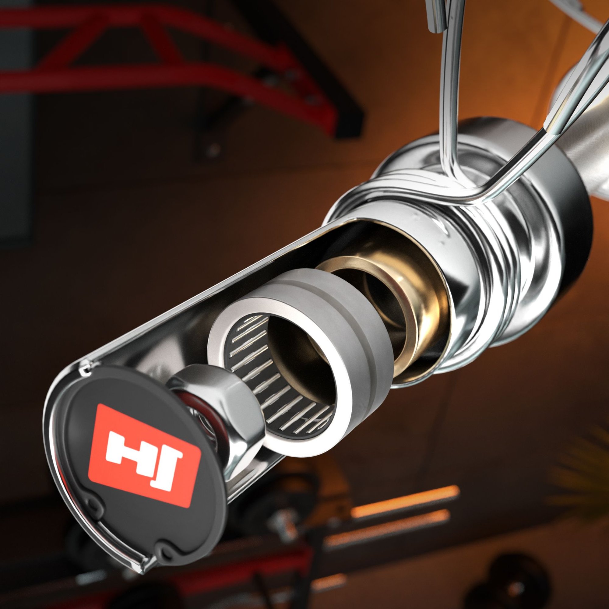 Il bilanciere è dotato di cuscinetti a strisciamento e ad aghi che consentono la rotazione libera della parte di carico. Grazie a loro puoi eseguire esercizi di forza intensi senza perdere fluidità. Per una sicurezza aggiuntiva, abbiamo incluso morsetti a molla nel bilanciere, che stringono efficacemente il carico senza graffiare i dischi.