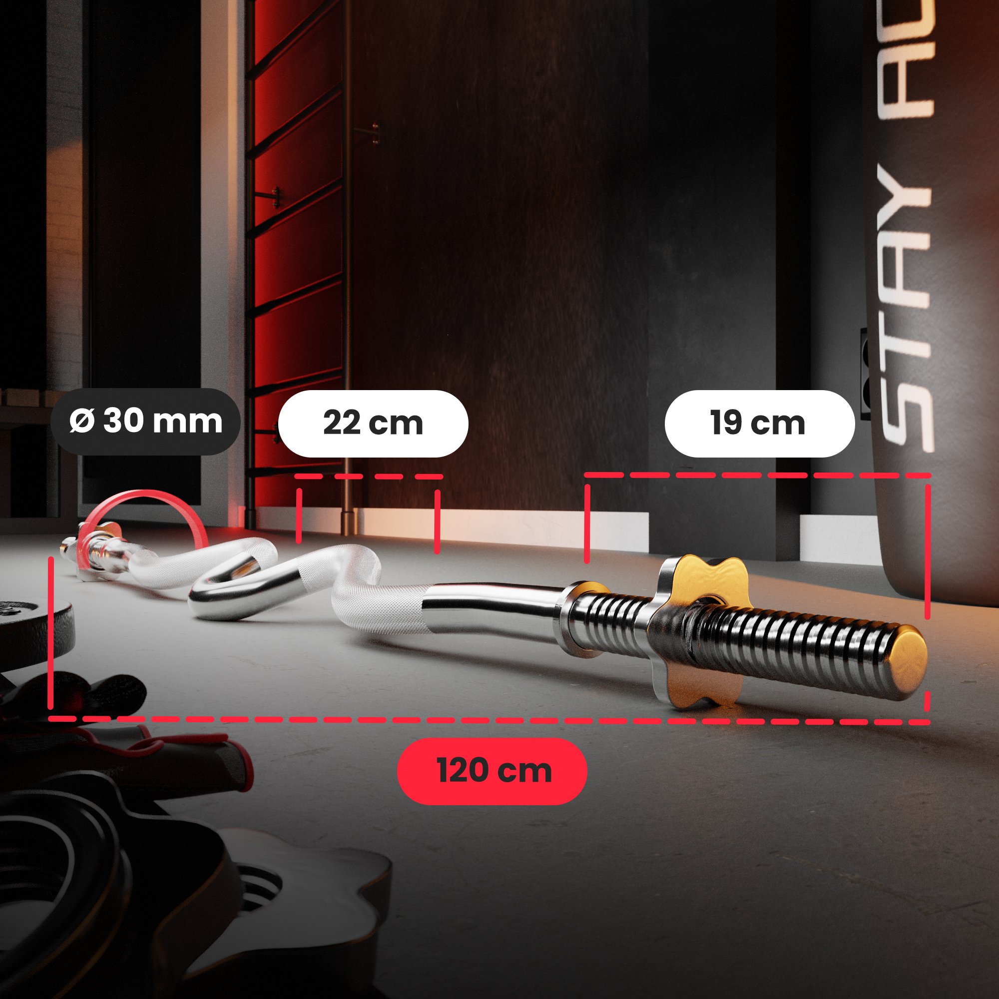 Le dimensioni dell'attrezzatura sono state perfezionate in modo tale da essere massimamente adattate agli esercizi quotidiani in una palestra domestica. Il bilanciere fortemente curvo 120 cm è ideale per il bilanciere – e in particolare per la pressa francese su panca. La sua struttura consente di allenare principalmente le parti superiori del corpo, coinvolgendo bicipiti, tricipiti e braccia.