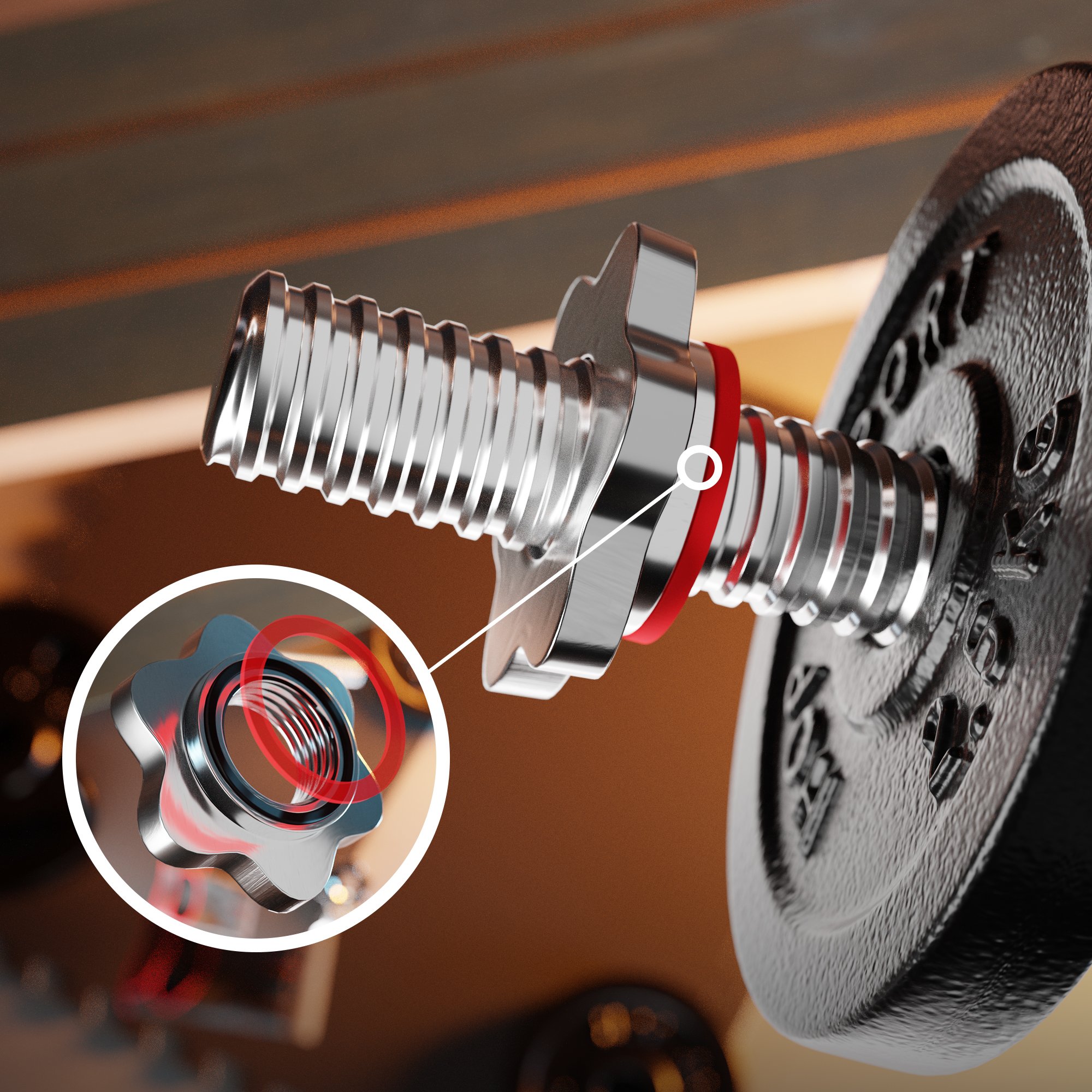 Il bilanciere è dotato di speciali estremità con superficie filettata. Il peso inserito su di esse non oscilla e non scivola nemmeno durante esercizi intensi. Inoltre, il peso può essere fissato con dadi cromati che lo stringono. Questi hanno guarnizioni in gomma che stabilizzano ancora meglio il peso sollevato.