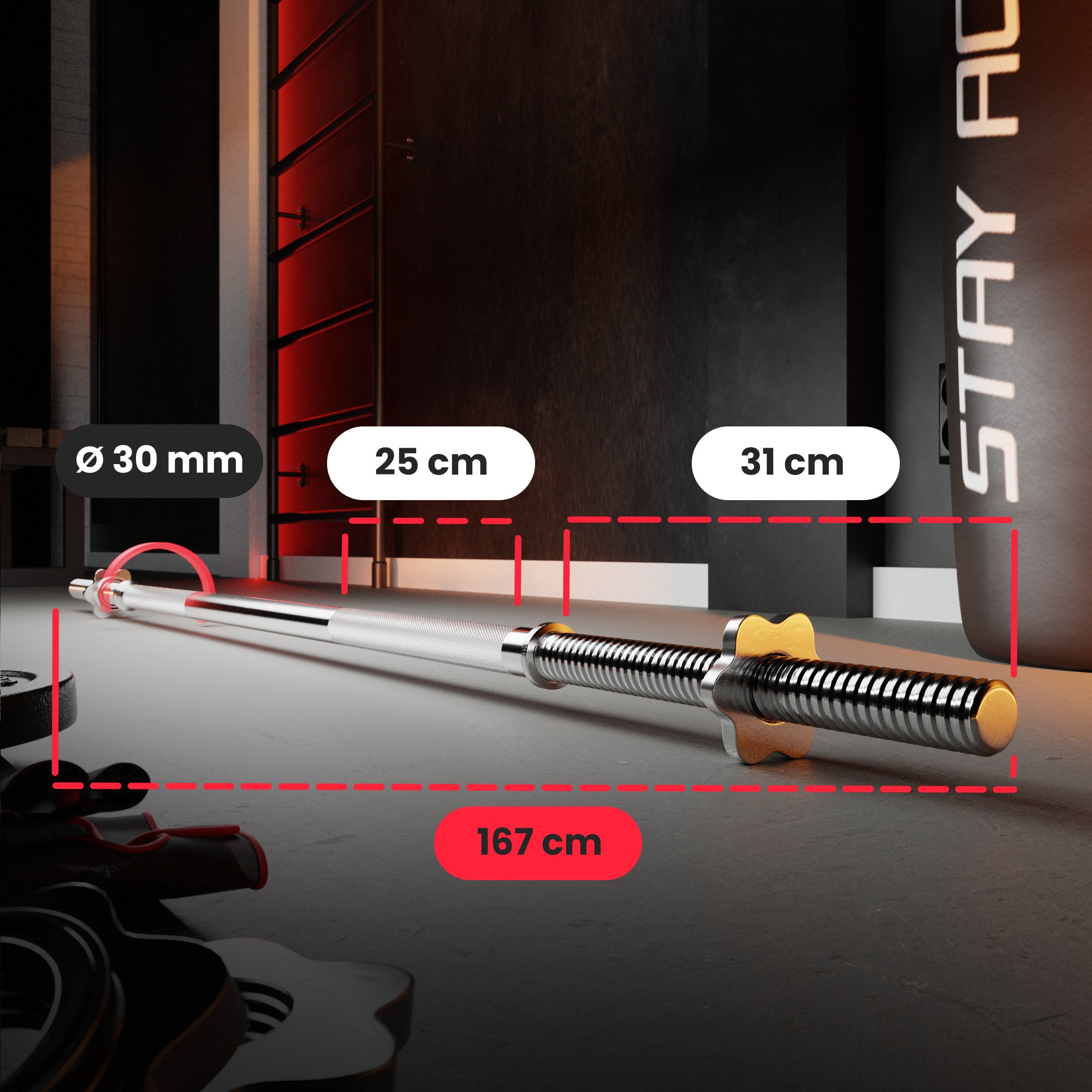 Le dimensioni dell'attrezzatura sono state perfezionate in modo tale da essere massimamente adattate agli esercizi quotidiani in una palestra domestica. Il bilanciere dritto 167 cm è ideale per il bilanciere, e con esso è possibile eseguire stacchi da terra, squat e pressioni con carichi variabili. Rimuovendo i dischi, possiamo riporlo nell'armadio o sotto il letto.
