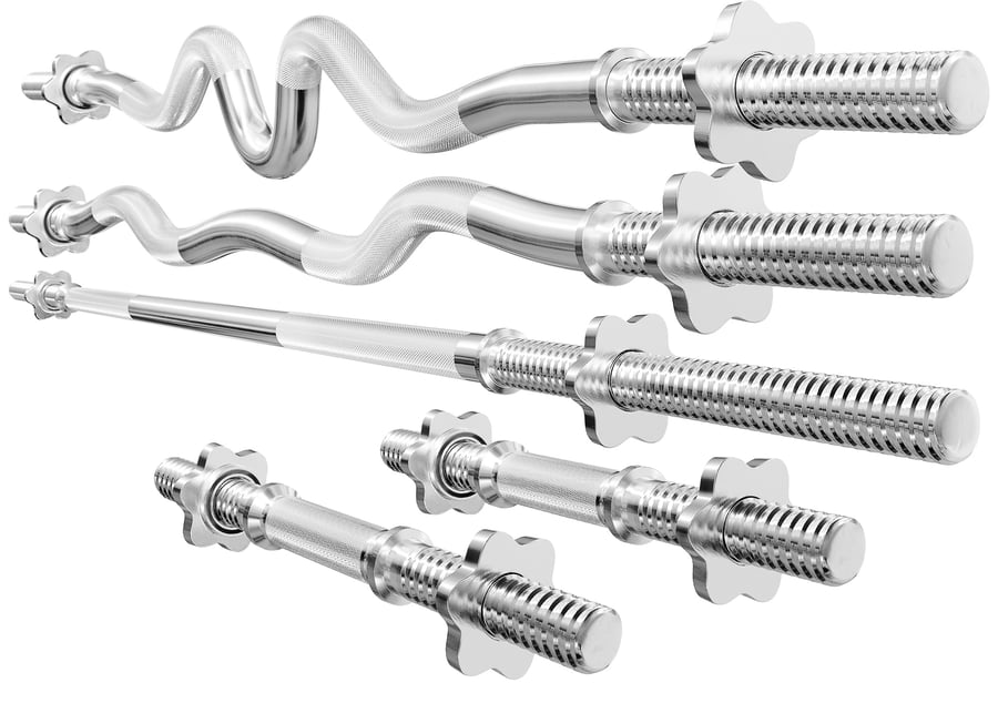 Set di bilancieri da palestra, in acciaio cromato con diametro di 30mm. Dotati di impugnatura antiscivolo e terminali filettati per un allenamento sicuro