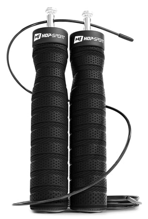 Corda per saltare con cuscinetti e impugnatura morbida HS-P030JR nera del marchio Hop-Sport è un semplice attrezzo che puoi utilizzare negli esercizi quotidiani - ti aiuterà a ridurre il tessuto adiposo, modellare i muscoli e migliorare la forma fisica. Nonostante la sua semplicità, la corda per saltare richiede precisione e buona tecnica. Gli esercizi con la corda per saltare coinvolgono tutto il corpo, dalle gambe fino alle spalle e al petto. La costruzione innovativa della corda con sistema di cuscinetti e cavo metallico permette di eseguire salti multipli durante un solo giro della corda. Un ulteriore vantaggio di questo modello di corda è la possibilità di regolare rapidamente la lunghezza del cavo.