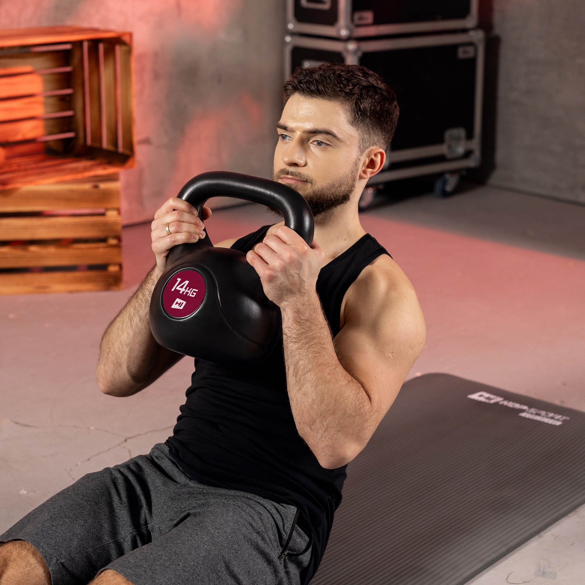 Kettlebell 14 kg, è un attrezzo destinato a esercizi generali volti a migliorare la condizione fisica, l'equilibrio, la forza e la coordinazione motoria. L'allenamento con il kettlebell ha il vantaggio rispetto agli esercizi standard con i manubri di coinvolgere un numero significativamente maggiore di muscoli. Il centro di gravità spostato si traduce in maggiori benefici dall'allenamento funzionale. Kettlebell 14 kg del marchio Hop-Sport è realizzato in massa bituminosa, situata nella parte centrale del kettlebell, rivestita in materiale PVC non tossico e amico della pelle. L'ampia impugnatura garantisce una presa sicura e confortevole, e la base piatta facilita notevolmente l'esecuzione degli esercizi e il riposizionamento del kettlebell dopo l'allenamento.