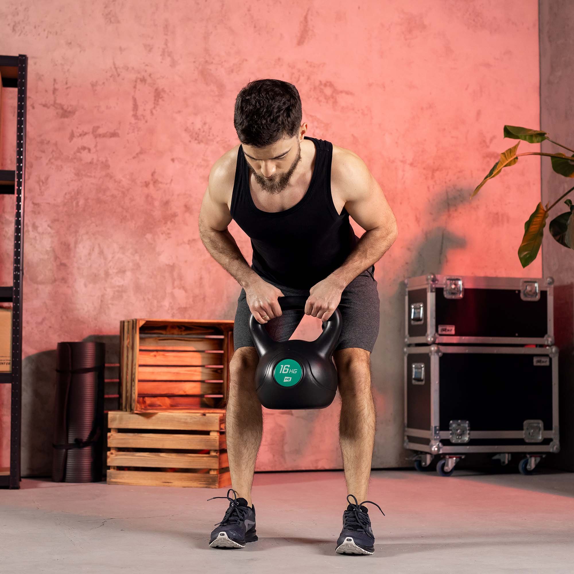 Il kettlebell in vinile, con un peso di 16 kg, è consigliato a chi punta su un allenamento di forza intenso, ma non solo. I kettlebell sono ottimi anche per esercizi cardio e allenamenti di resistenza, e il loro utilizzo consente di coinvolgere un numero maggiore di gruppi muscolari rispetto agli esercizi con manubri tradizionali. Il kettlebell da 16 kg del marchio Hop-Sport, è realizzato in resistente materiale PVC non tossico, e il suo design, composto da un'impugnatura comoda e larga e una base piatta, garantisce il comfort degli esercizi quotidiani.