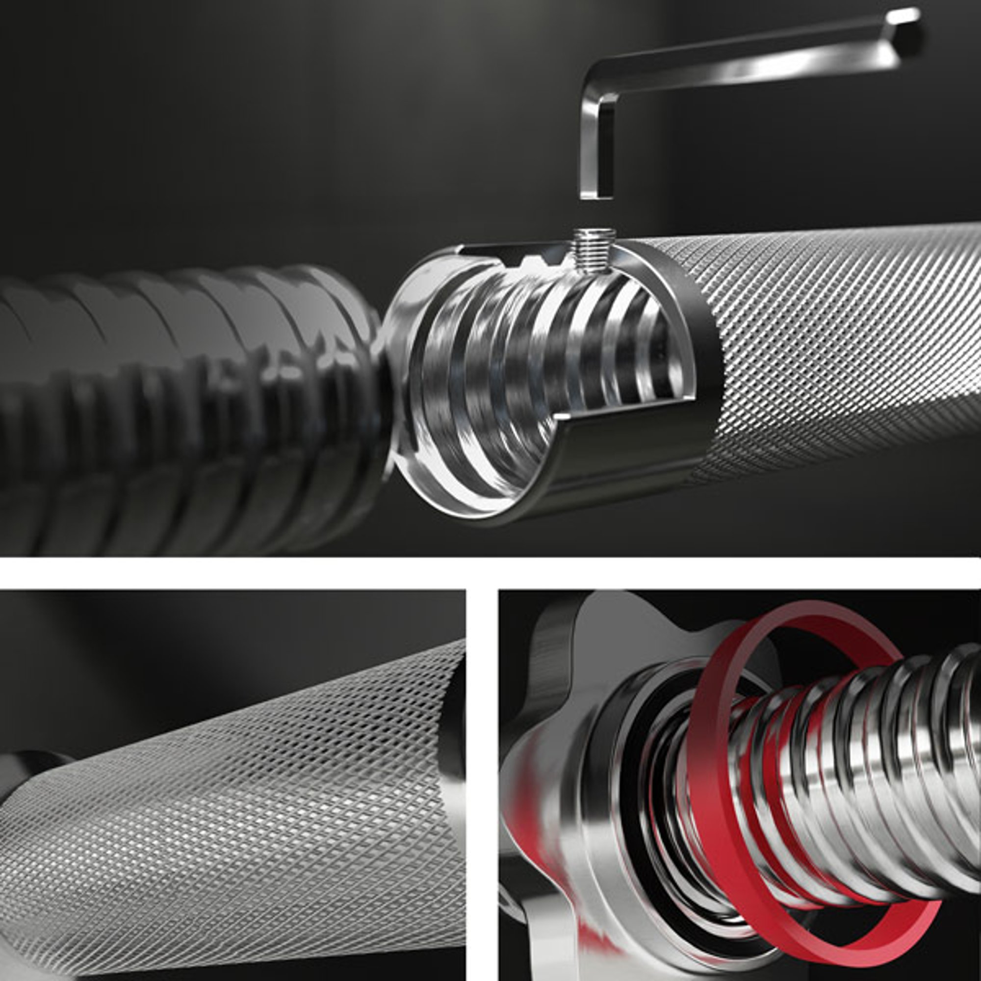 Abbiamo incluso nel set due bilancieri in acciaio cromato con un diametro di 30 mm con una parte di presa zigrinata e estremità filettate. Possono essere estesi in qualsiasi momento utilizzando un connettore speciale con filettatura. In questo modo otterremo manubri o un bilanciere per l'allenamento della forza. Per una maggiore sicurezza, il connettore può essere bloccato con una chiave a brugola inclusa nel set. Nel set troverai anche dadi filettati con guarnizioni in gomma, utilizzati per fissare i pesi.