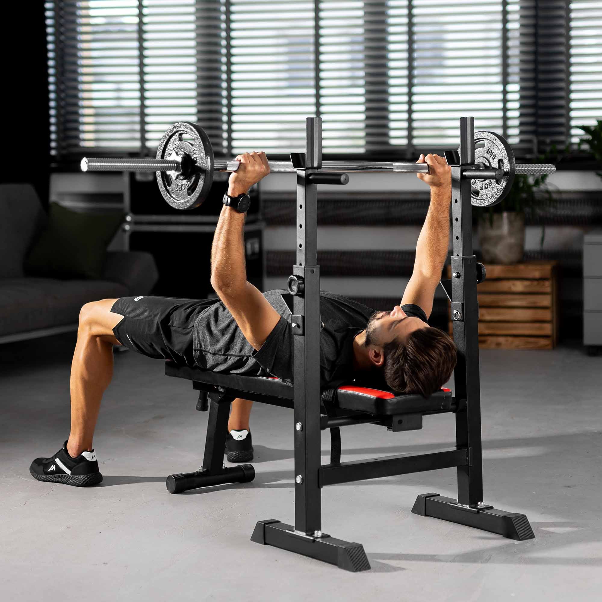 In questa panca puoi regolare l'altezza dei supporti per il bilanciere, permettendo di adattare la panca da allenamento alle esigenze individuali. La regolazione dell'altezza dei supporti è possibile in 5 livelli. I supporti sono dotati di sicurezza , il che aumenta la sicurezza durante l'allenamento.