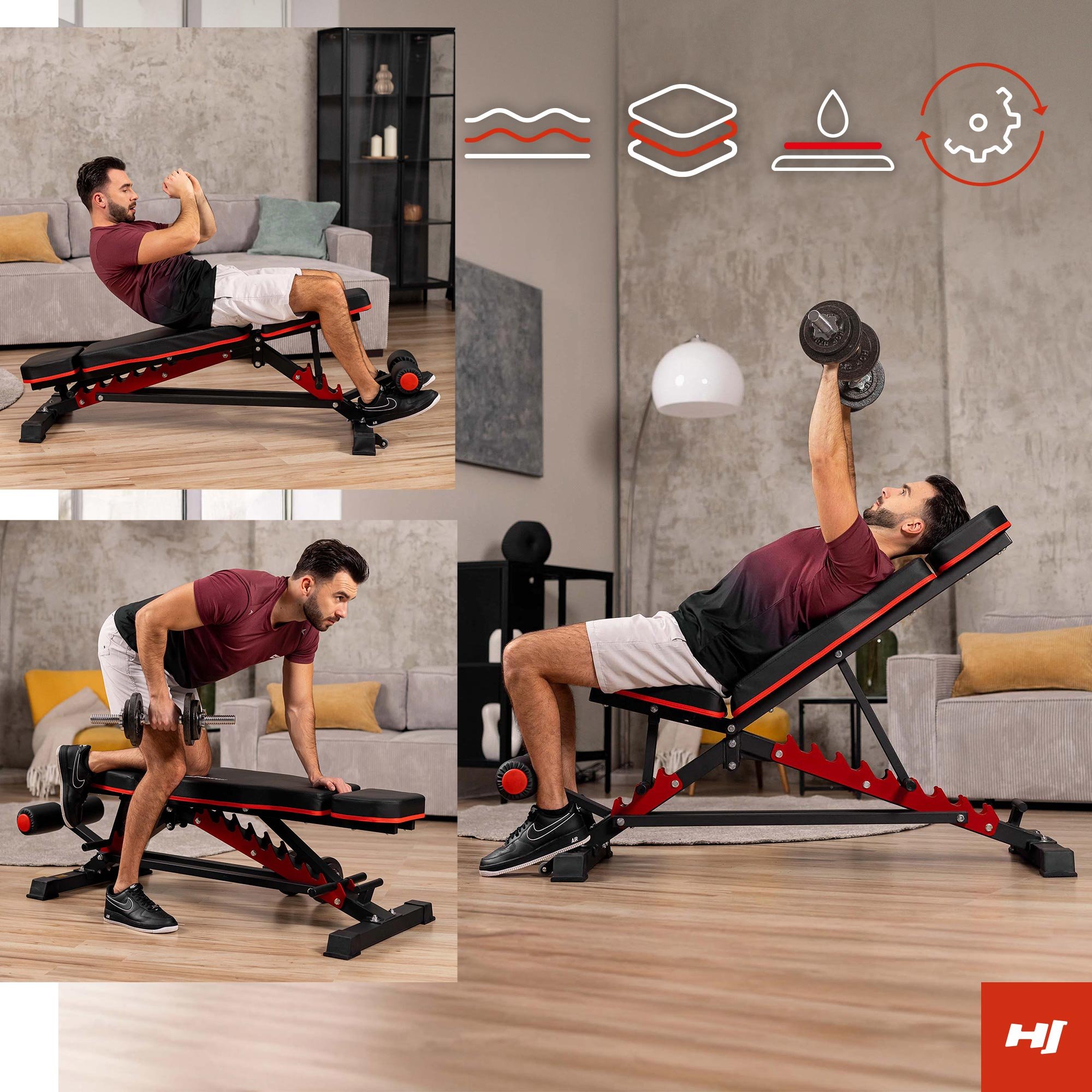 Panca da allenamento regolabile e resistente HS-2090HB con blocco per le gambe. Imbottitura spessa e resistenza fino a 300 kg garantiscono un allenamento sicuro e confortevole.