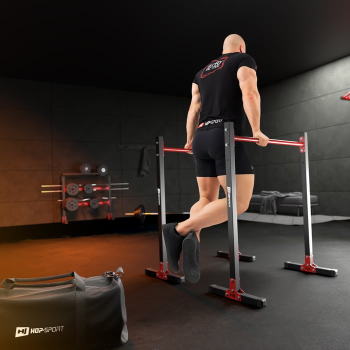 Dip parallele calisthenics stazionarie indipendenti per flessioni, dips HS-1011K del marchio Hop-Sport. Parallele realizzate con profili in acciaio spessi, dotate di piedini antiscivolo