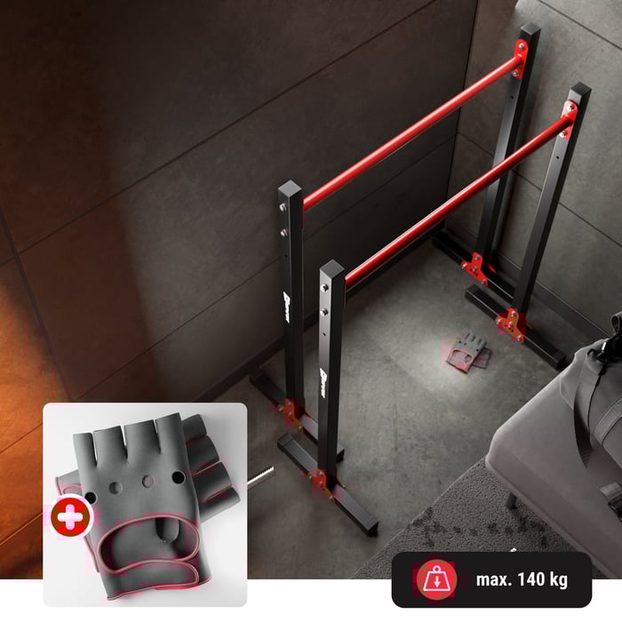 HS-1011K sono parallele indipendenti per esercizi che puoi impostare in qualsiasi configurazione e adattare alle tue esigenze di allenamento individuali. L'attrezzatura non occupa molto spazio e la sua capacità massima di carico è di 140 kg . Nel set abbiamo incluso comodi guanti in neoprene che prevengono la formazione di scottature e abrasioni durante l'esercizio.