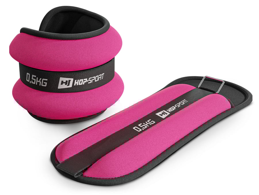 Set di pesi per braccia e caviglie 2x0,5kg in colore rosa. Chiusura: regolabile a strappo, taglia universale. Riempiti con sabbia speciale.