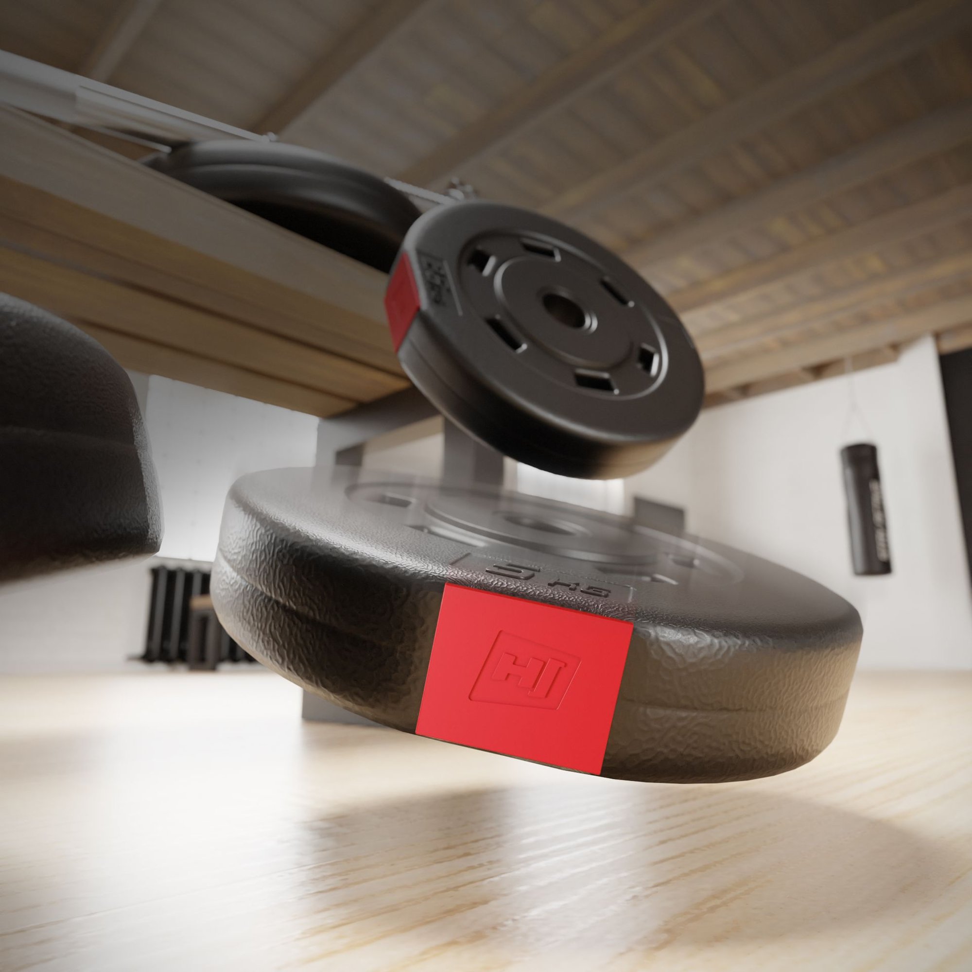 Per un maggiore comfort di allenamento i pesi compositi sono costruiti in modo tale che uno dei bordi dei dischi sia smussato. Il tappo blocca efficacemente i pesi in posizione verticale, in modo che il peso sia protetto da rotolamenti accidentali , il che influisce non solo sul comfort, ma anche sulla sicurezza dell'utente.