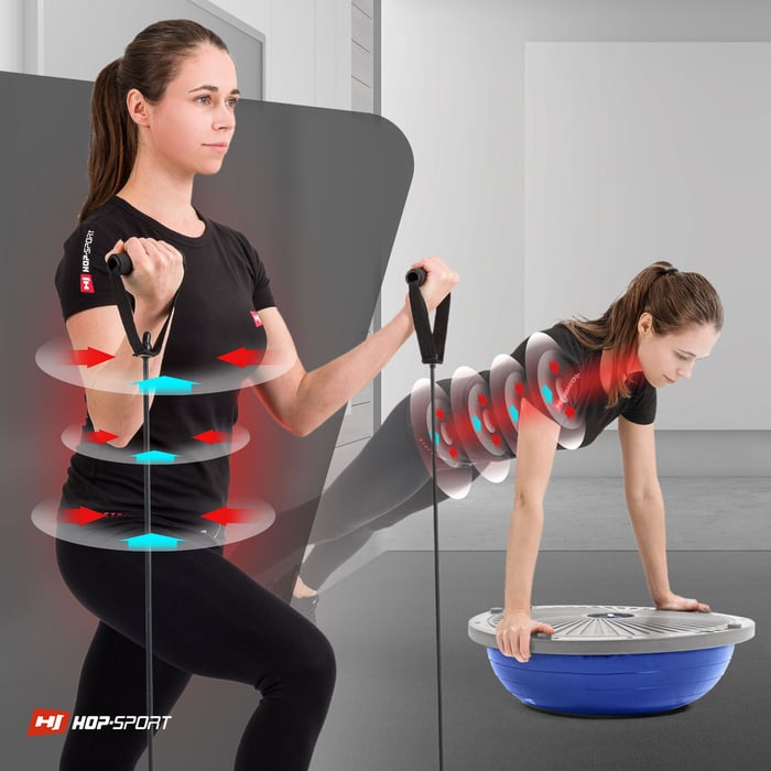 Grazie alla sua struttura, la piattaforma di bilanciamento è anche chiamata mezza palla – infatti assomiglia a una palla da fitness tagliata a metà, posizionata su una base stabile. Durante l'allenamento, la piattaforma può essere posizionata con la cupola semicircolare verso l'alto o al contrario – con la base piatta verso l'alto. Entrambe le posizioni consentono di eseguire un ampio spettro di esercizi in diverse posizioni – in ginocchio, seduti, sdraiati, in piedi. Sulla piattaforma si può anche correre e fare salti, il che la rende sempre più popolare tra gli appassionati di allenamento aerobico.