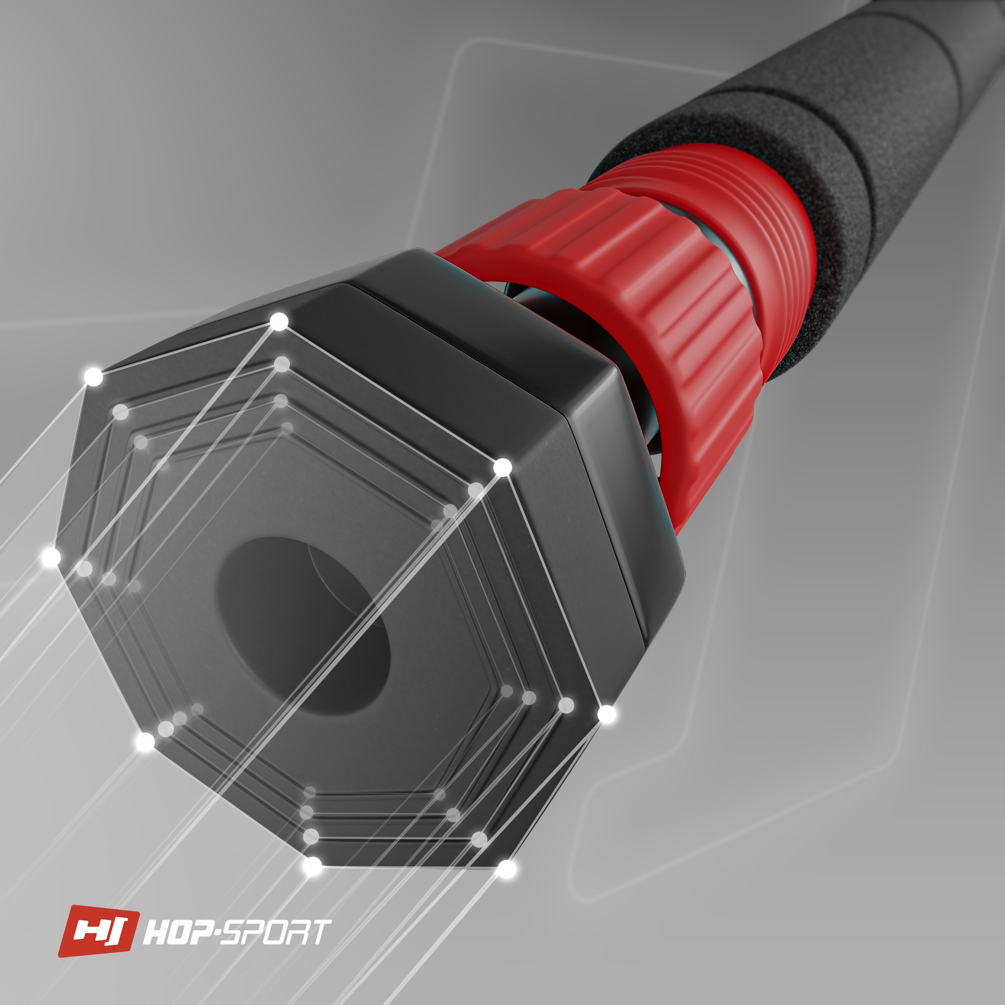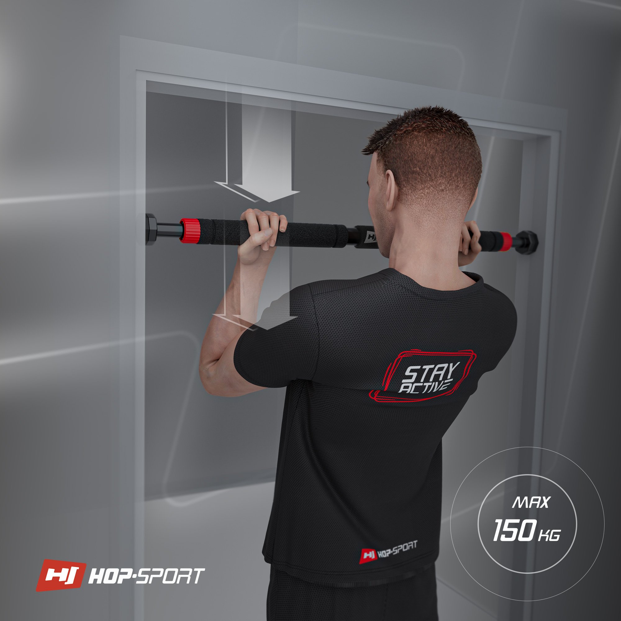 Barra trazioni - Sistema di pressione a otto punti, piedini in gomma antiscivolo. Rivestimento a tre strati. L'allenamento con la barra Hop-Sport consente di migliorare la forza.