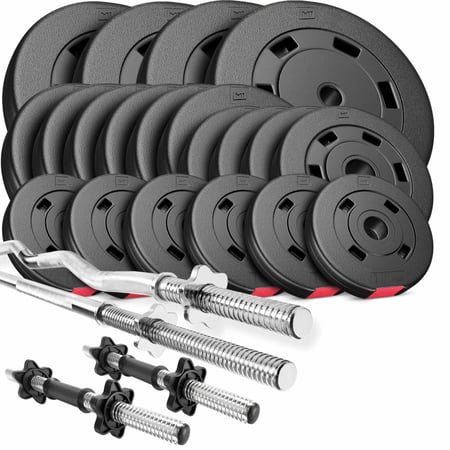 Bilanciere da 105kg con possibilità di regolare i pesi. Aste in acciaio resistenti e dischi bituminosi costituiscono una combinazione ideale per ogni tipo di allenamento. Set di dischi per palestra a casa
