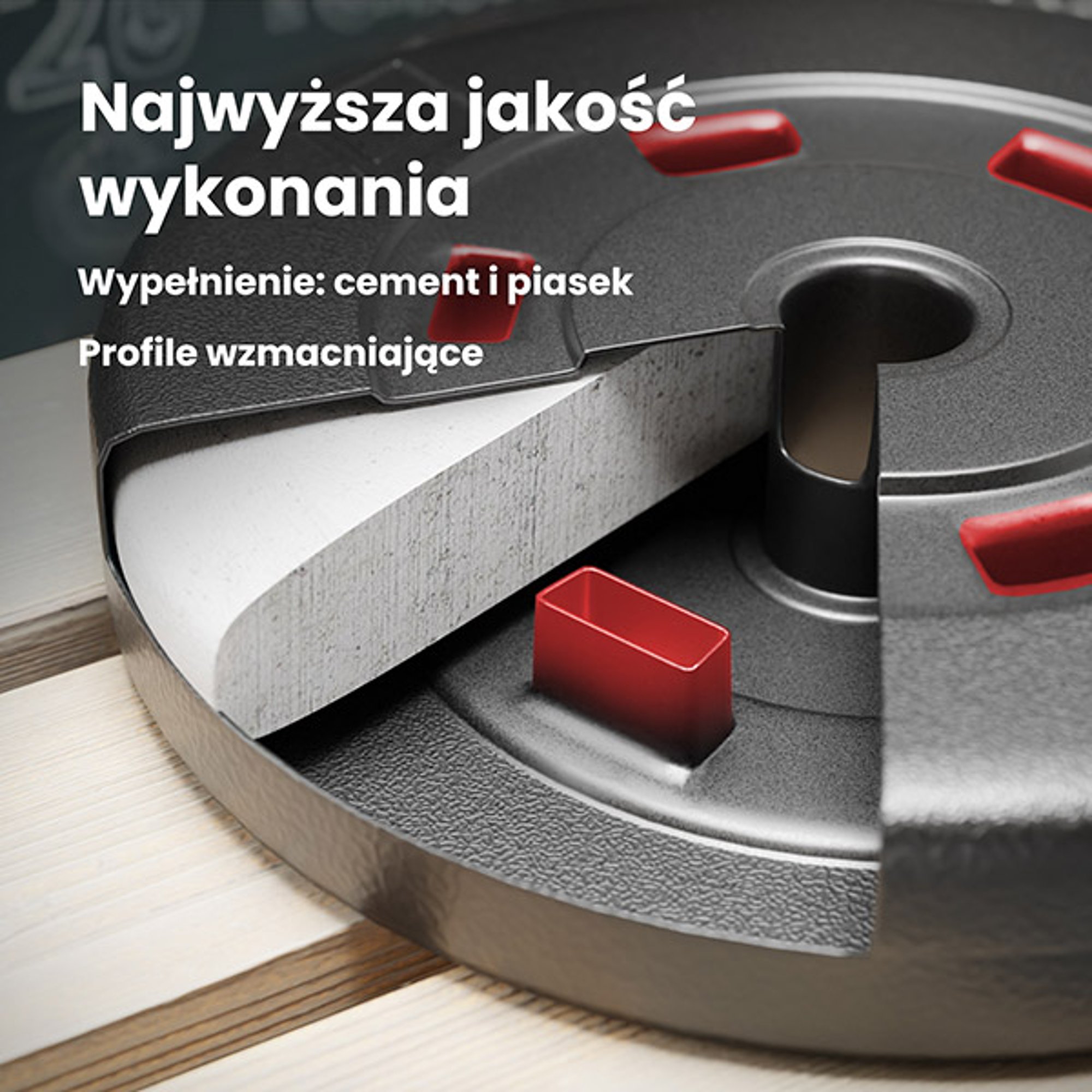 Ciò che distingue i pesi bituminosi di Hop-Sport è la loro struttura solida . I profili interni di rinforzo garantiscono una maggiore resistenza ai danni meccanici e alle rotture. Inoltre, la superficie esterna multistrato con struttura ruvida è meno soggetta a graffi rispetto ai pesi lisci. Il riempimento dei pesi bituminosi è costituito da una combinazione di sabbia e cemento.