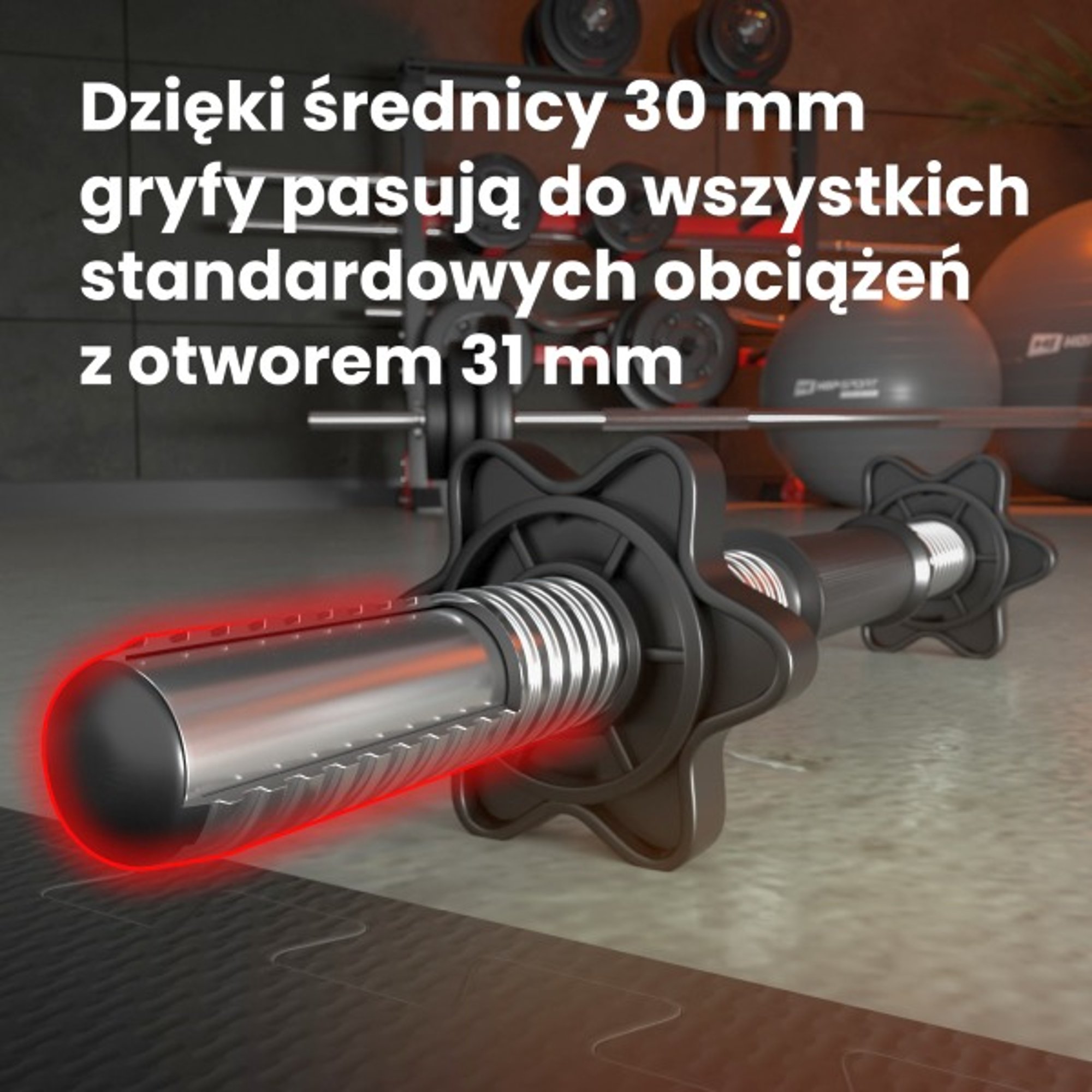 La struttura del bilanciere è costituita da un tubo in acciaio rivestito da uno strato sintetico di alta qualità, ulteriormente protetto da un rivestimento cromato. La sua capacità massima di carico è di 50 kg. L'attrezzatura è stata realizzata in modo tale che nella parte di presa il suo diametro sia di 30 mm. Grazie a ciò il bilanciere si adatta bene alle mani ed è in grado di sostenere pesi davvero elevati. Il peso dedicato a questa attrezzatura sono le piastre bituminose.