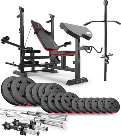 . Il set di pesi con bilancieri, panca regolabile, lat machine e preacher curl consente l'allenamento culturistico e generale.