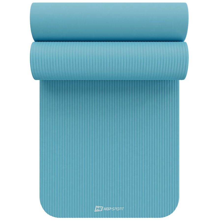 Tappetino NBR azzurro antiscivolo e resistente, spesso 1,5 cm, del marchio Hop-Sport. Le dimensioni maggiori garantiscono comodità e comfort durante gli esercizi.