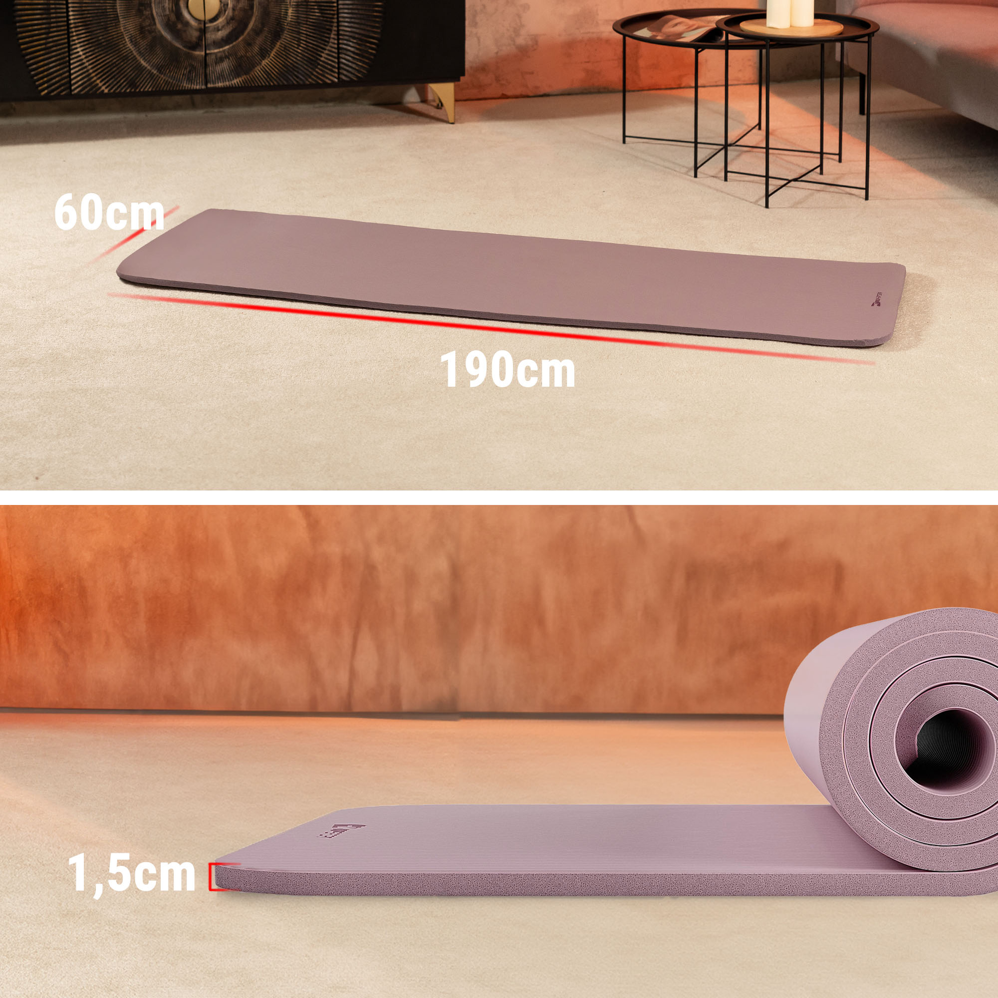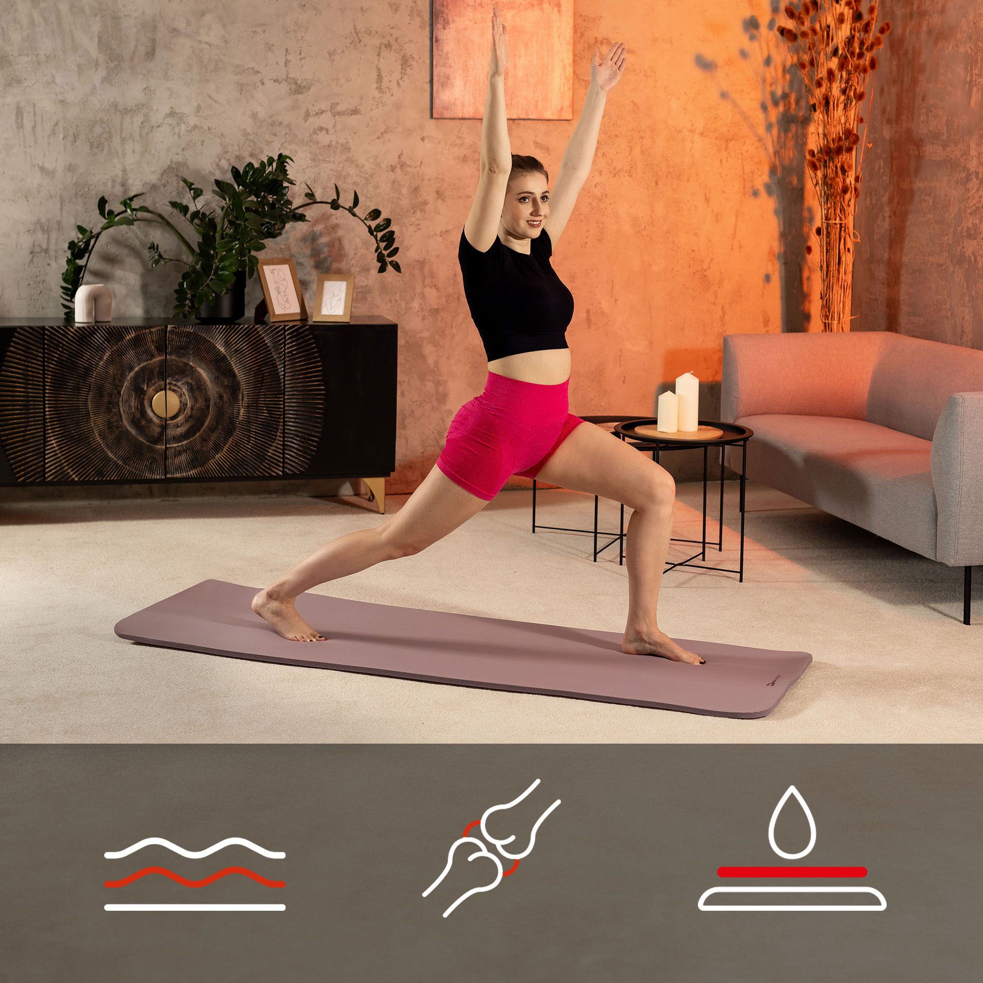 Tapettino per fitness, yoga o pilates, con cinghia di trasporto ed antiscivolo. Tapettino per esercizi a casa o palestra. Spesso 1,5 cm, antiscivolo e resistente, il tappetino lavanda NBR del marchio Hop-Sport. Le dimensioni maggiori garantiscono comodità e comfort durante gli esercizi.
