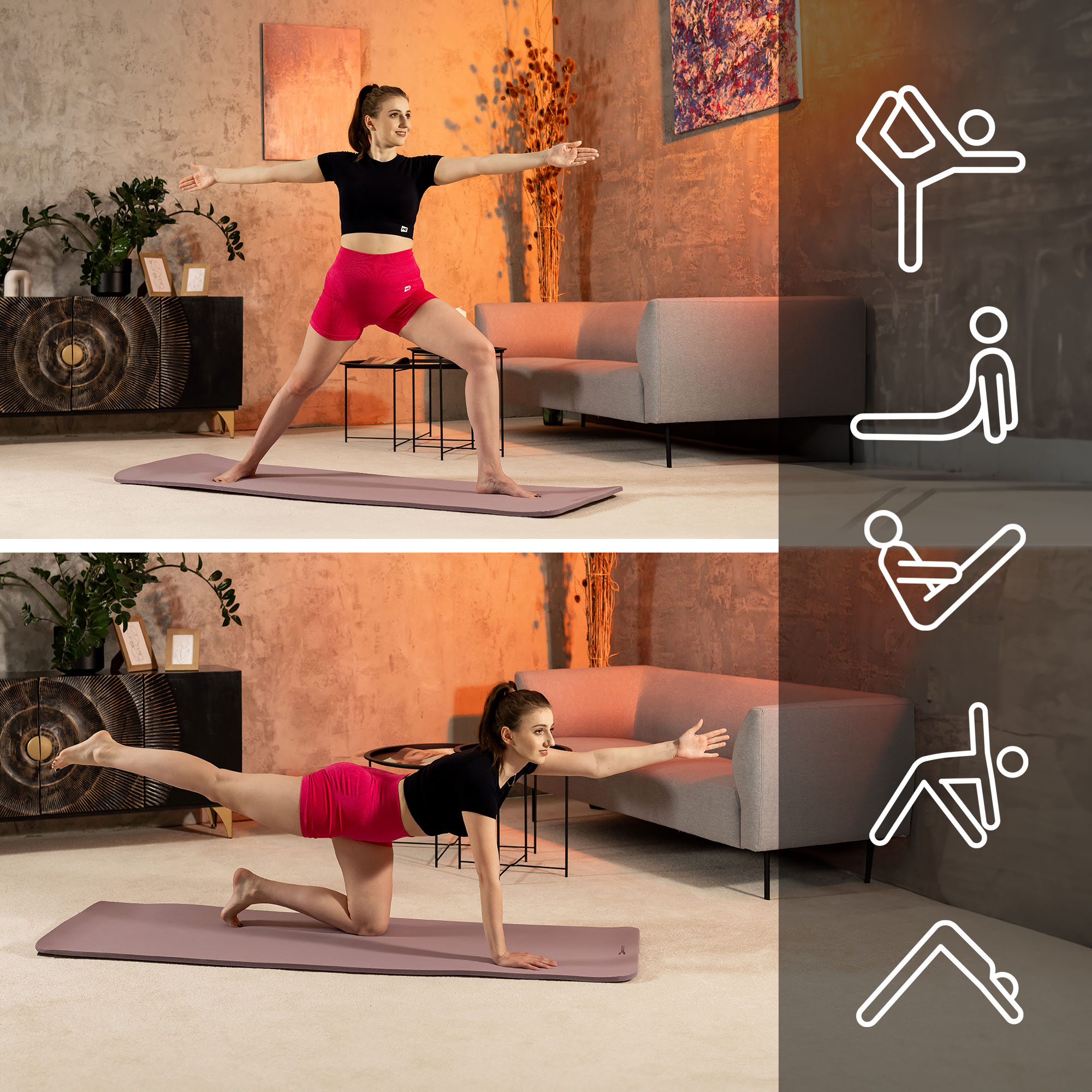 Il tappetino NBR da 1,5 cm è adatto a diversi tipi di allenamenti. Puoi praticare yoga, pilates, eseguire cardio dinamico e esercizi di forza che generano maggiori carichi sulle articolazioni e richiedono un'adeguata isolazione e ammortizzazione dal terreno duro. La combinazione dello spessore di 1,5 cm con le dimensioni maggiori del tappetino garantisce comodità e sicurezza in ogni sessione di allenamento. Inoltre, la struttura unica del tappetino offre un'ottima aderenza, che consente una tenuta stabile delle posizioni e l'esecuzione precisa di movimenti complessi durante gli allenamenti di forza.
