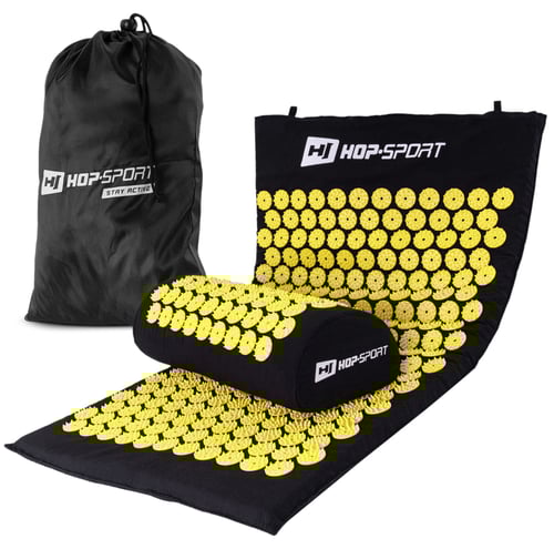 Set di agopressione - giallo del produttore Hop-Sport è uno strumento semplice da usare ed efficace per il rilassamento, che attraverso la sua azione aiuta a rimuovere le tensioni muscolari e migliora la circolazione sanguigna. Consigliato in particolare per le persone che soffrono di dolori alla colonna vertebrale, mal di testa e anche in caso di insonnia. Il set di agopressione Hop-Sport (tappetino + cuscino), è dotato di 7685 punte in plastica, posizionate su rosette appositamente progettate, che forniscono un massaggio intenso e rilassante per tutto il corpo.