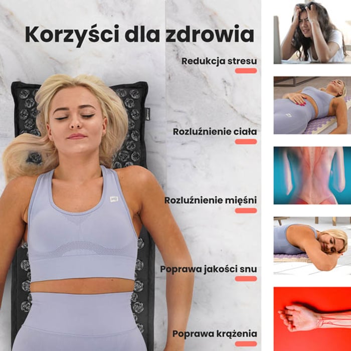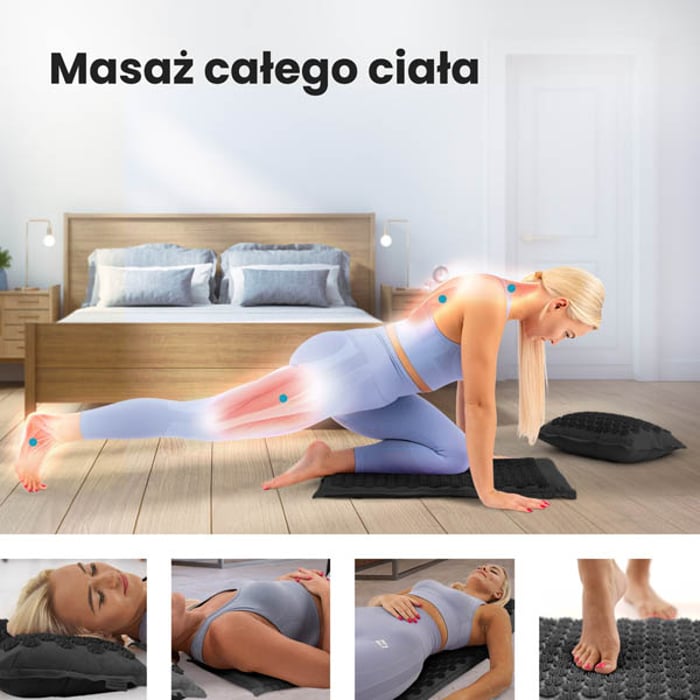 Puoi utilizzare il set per agopressione in molti modi. Il tappetino steso sul pavimento o sul letto consente il massaggio della schiena e degli arti superiori e inferiori (comprese le piante dei piedi). Il cuscino, invece, può essere utilizzato come supporto massaggiante per il collo o per la zona lombare in posizione sdraiata o seduta. Consente anche il massaggio degli arti – basta posizionare il cuscino sotto la gamba o il braccio per almeno 5 minuti.