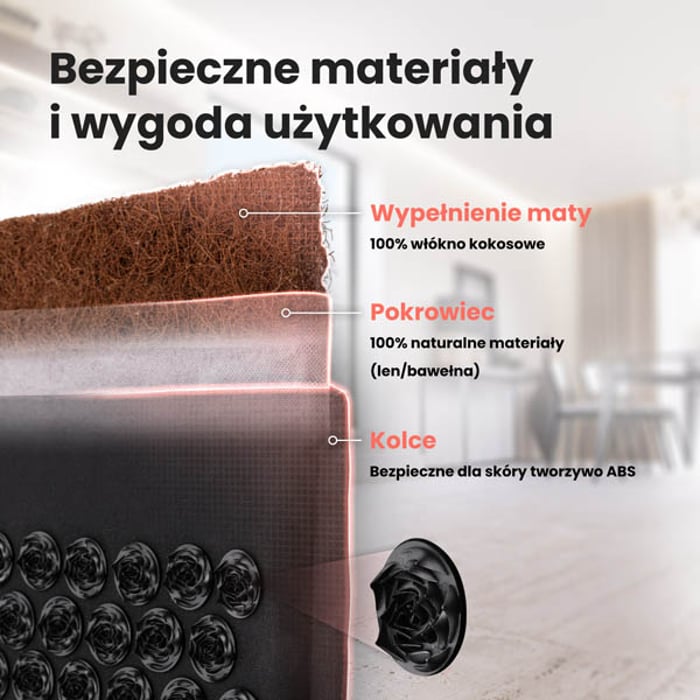 Il tappetino e il cuscino sono realizzati con materiali ecologici. Il 30% è costituito da lino antibatterico e anallergico – leggero, ma allo stesso tempo estremamente resistente. Il 70% è invece cotone PP. Il tappetino ha una struttura a strati, composta da: una fodera in lino morbida al tatto, una copertura in tessuto non tessuto che protegge la fibra di cocco da sfilacciamenti o spostamenti e un inserto elastico in fibra di cocco – uno dei materiali più leggeri al mondo. L'interno del cuscino è invece riempito con cotone PP estremamente elastico. Le rosette massaggianti sono realizzate in plastica sicura (ABS). La fodera del tappetino e del cuscino è rimovibile, quindi, se necessario, puoi lavarla a mano con un detergente delicato (attenzione – non lavare la fodera in lavatrice né asciugarla in asciugatrice). È importante evitare di immergerla a lungo durante la pulizia. Il set è stato realizzato con particolare attenzione ai dettagli e alle finiture, rendendolo il miglior set per agopressione sul mercato. Particolare attenzione meritano le punte ad alta nitidezza, che aumentano ulteriormente la pressione e, quindi, migliorano gli effetti dell'uso.