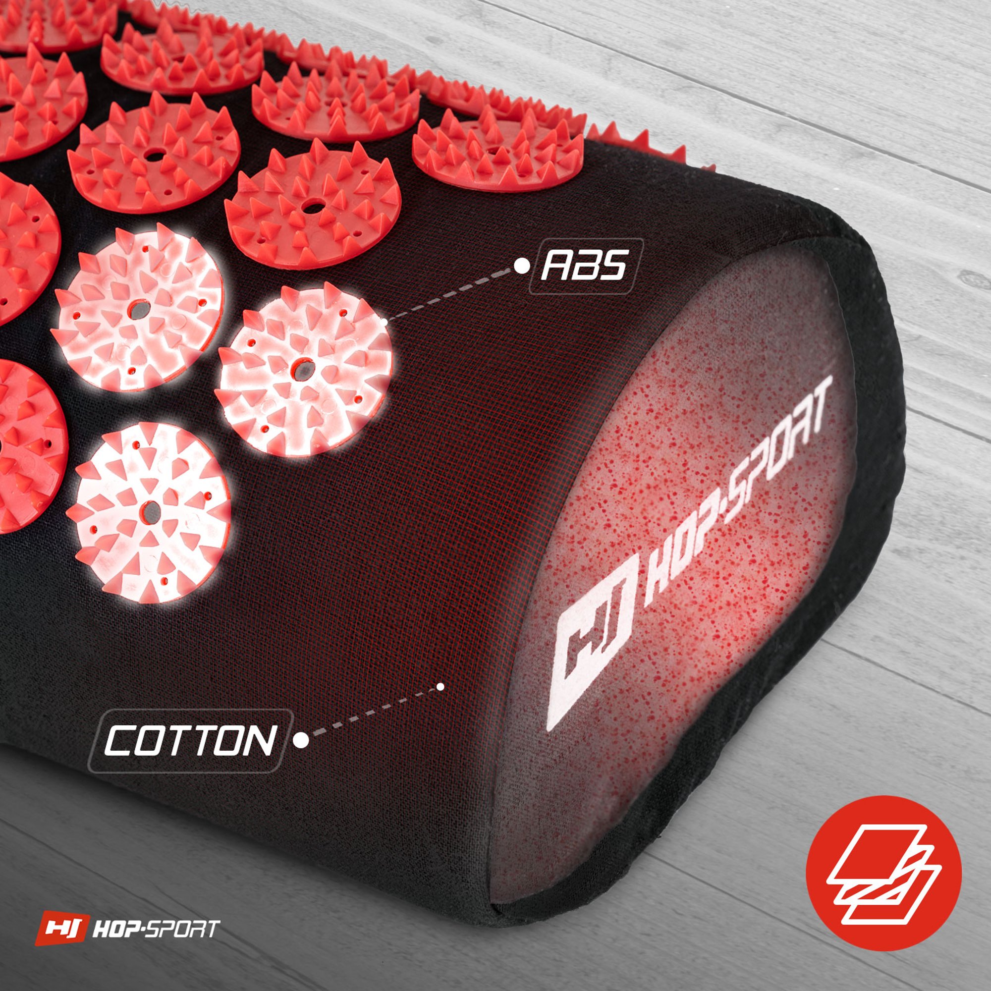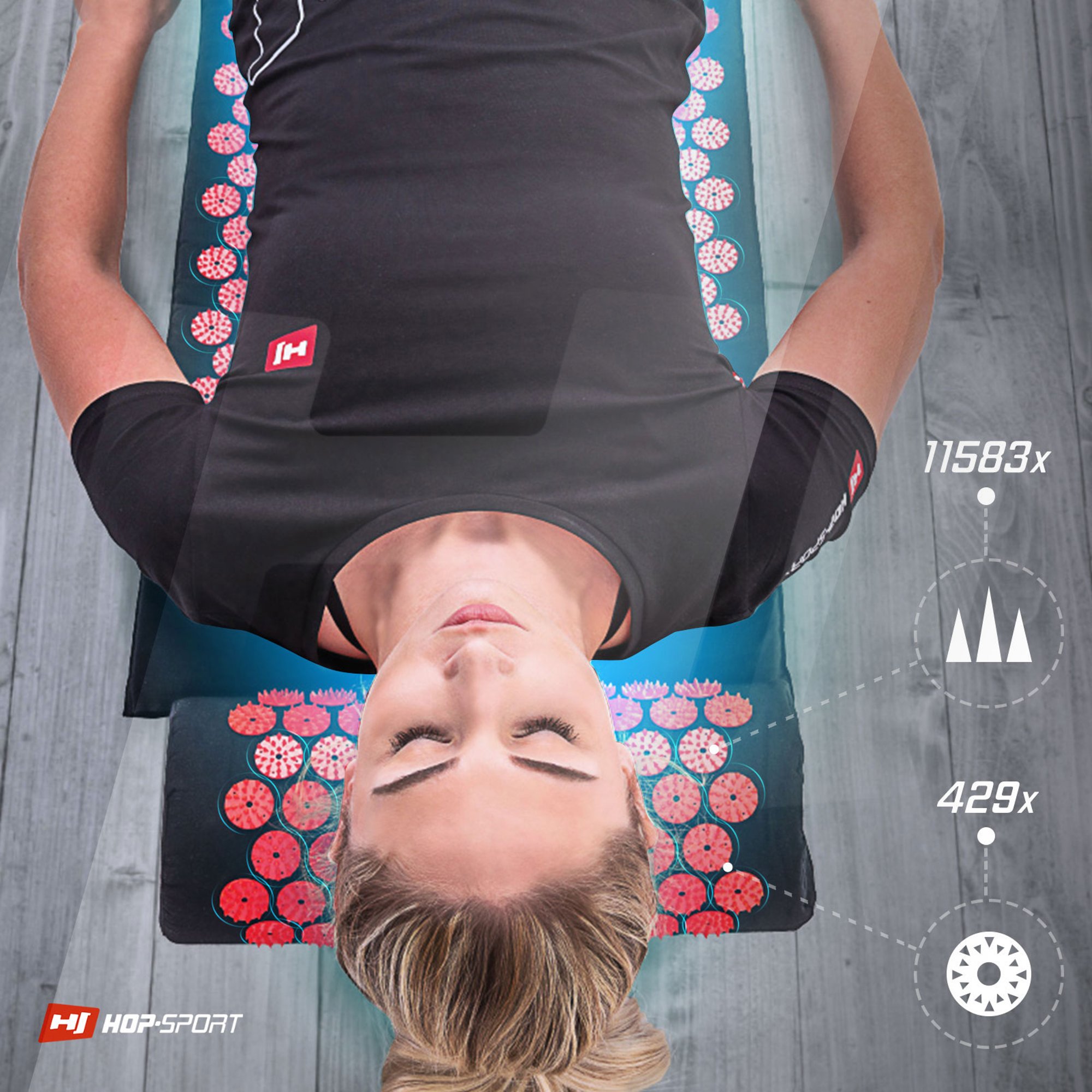 Insieme, sul tappetino e sul cuscino per agopressione Hop-Sport ci sono 429 rosette, su cui sono posizionati ben 11583 punti di pressione (punte). La forma speciale e la densità adeguata delle rosette sul tappetino fanno sì che le punte forniscano una pressione ottimale sul corpo dell'utente.