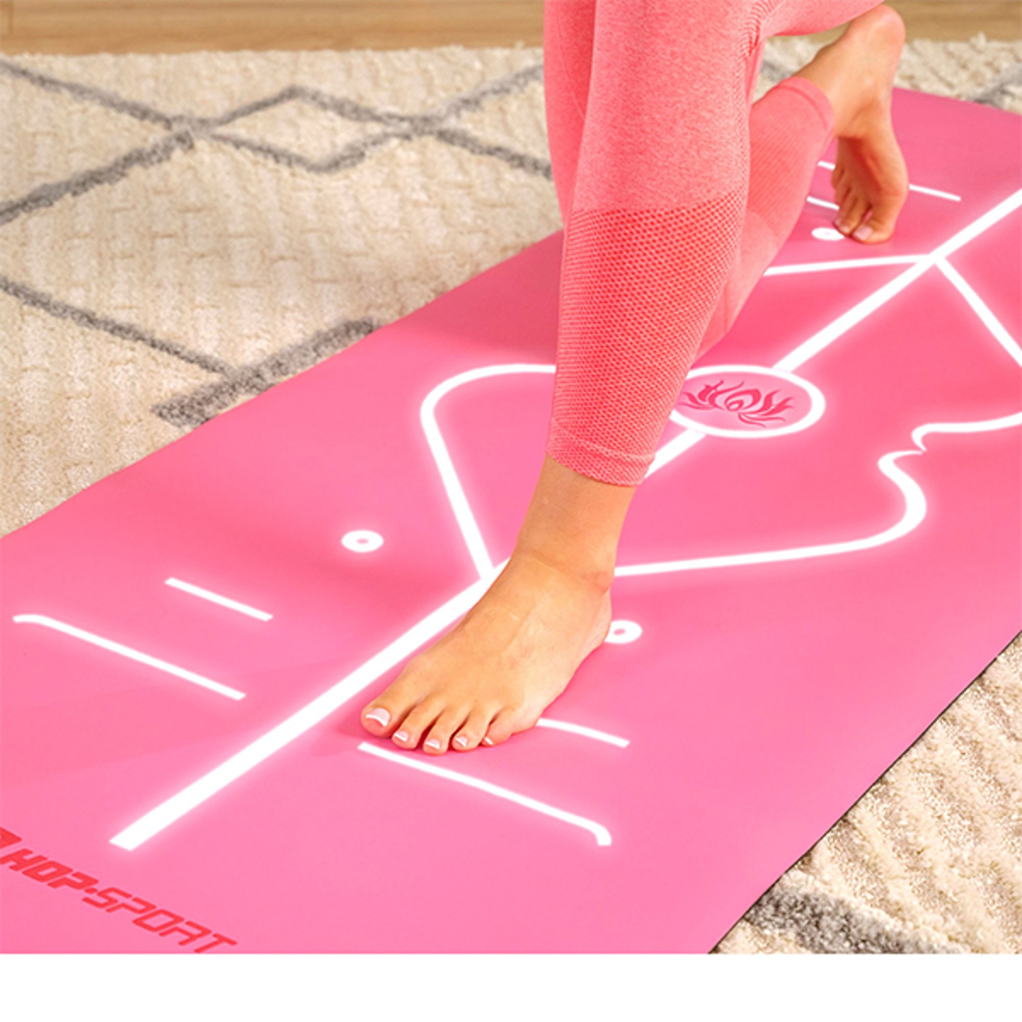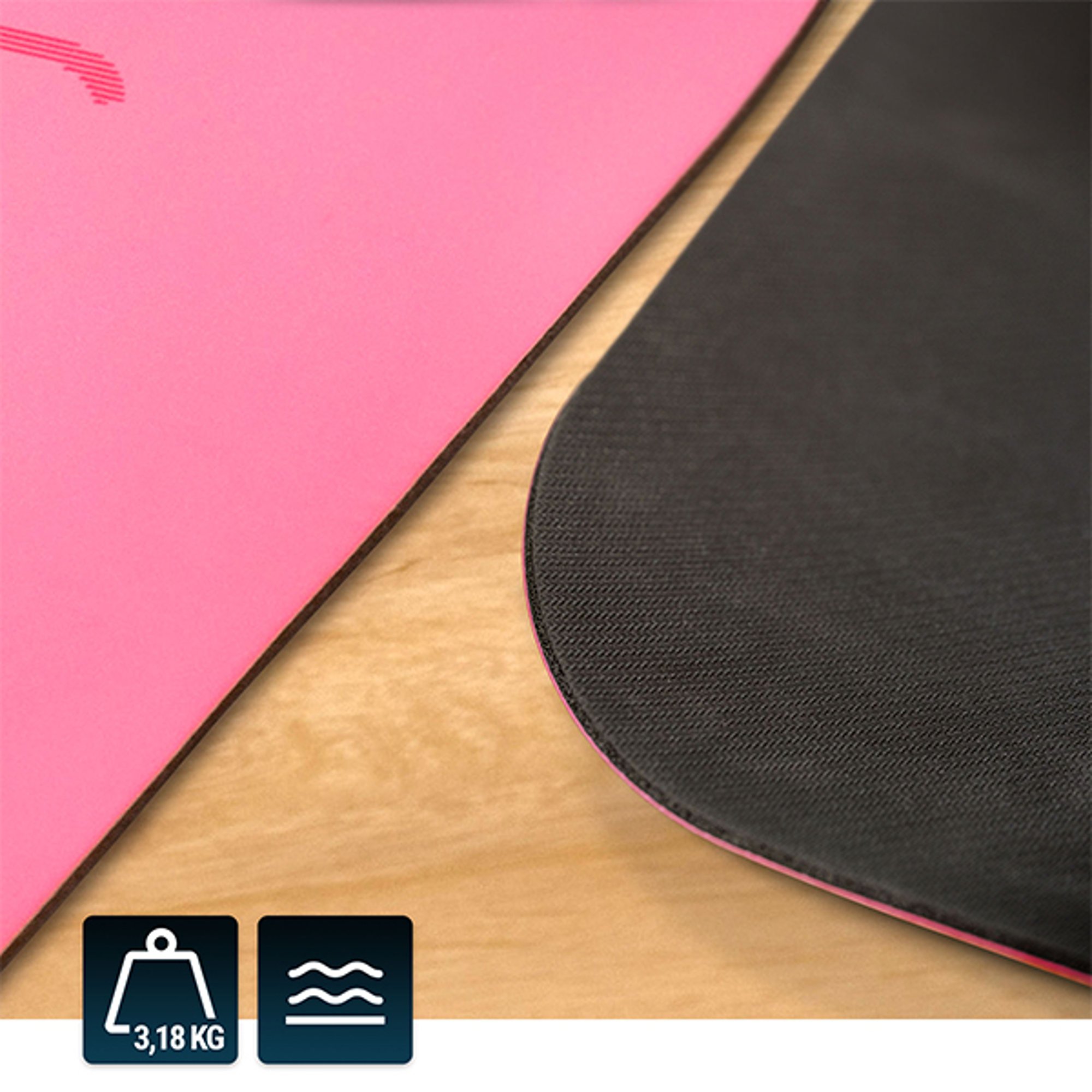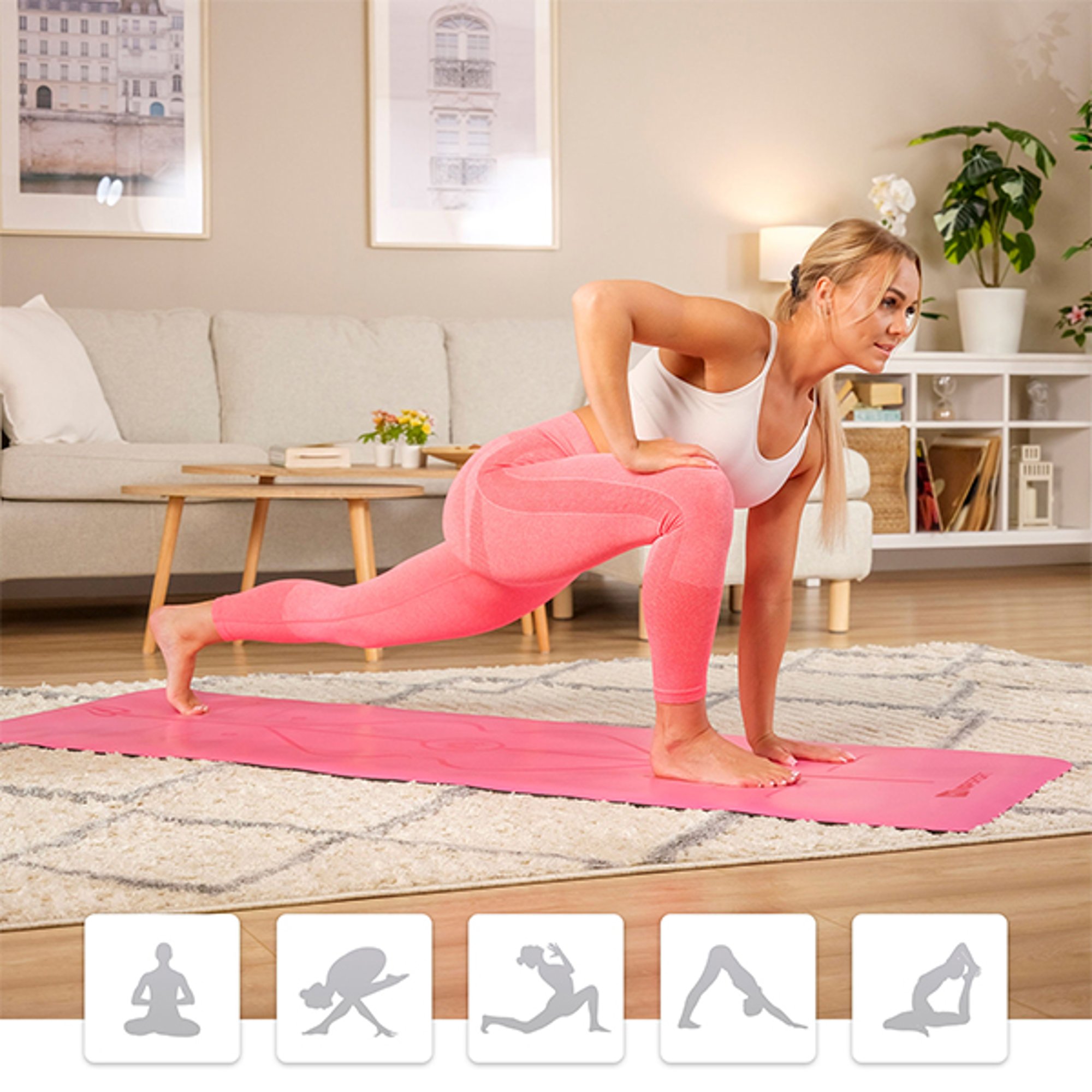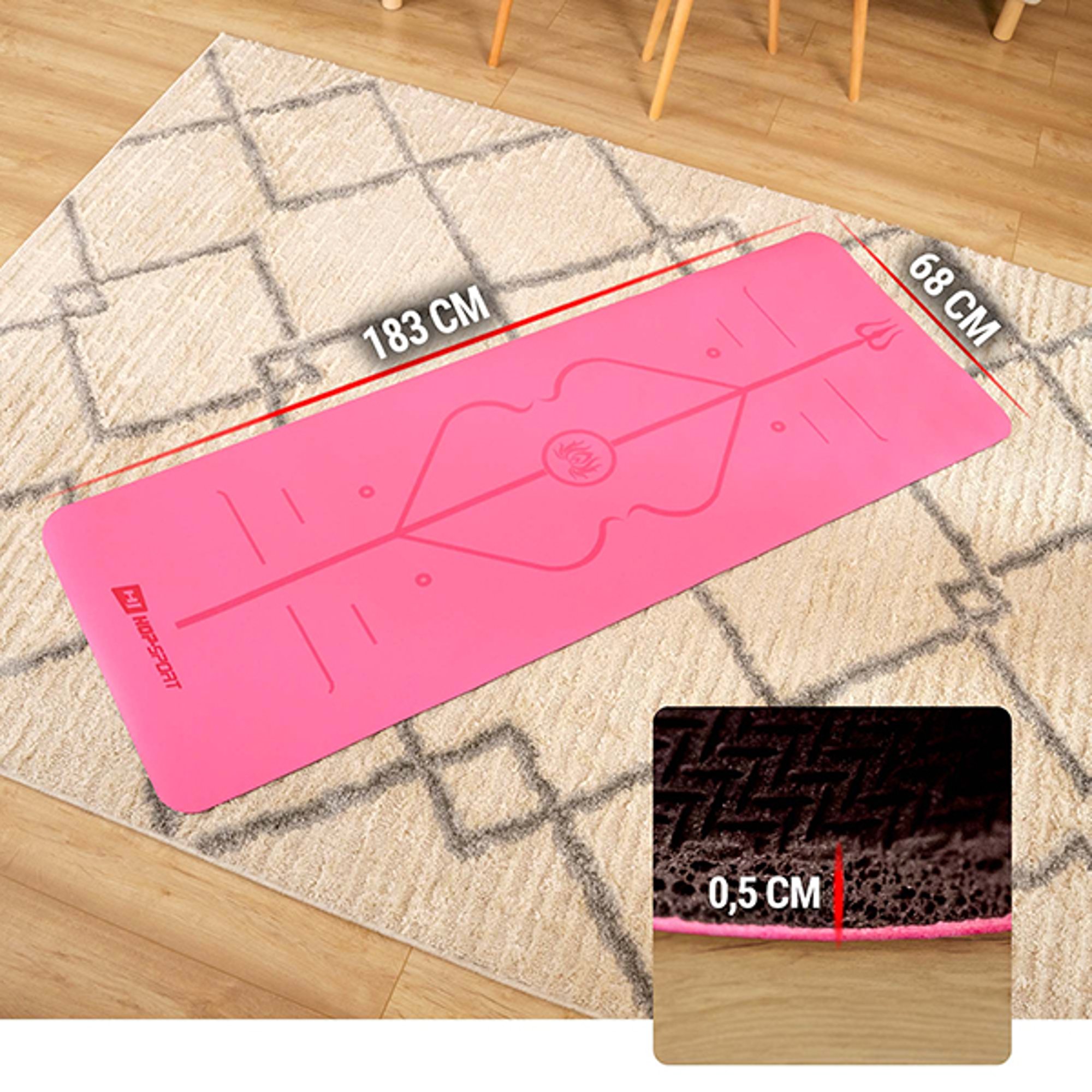 Tapettino per fitness, yoga o pilates, con cinghia di trasporto ed antiscivolo. Tapettino per esercizi a casa o palestra. Tappetino antiscivolo per esercizi PU 0,5cm rosa. Tappetino da yoga di dimensioni 183x68 cm dotato di linee che indicano la corretta posizione del corpo.