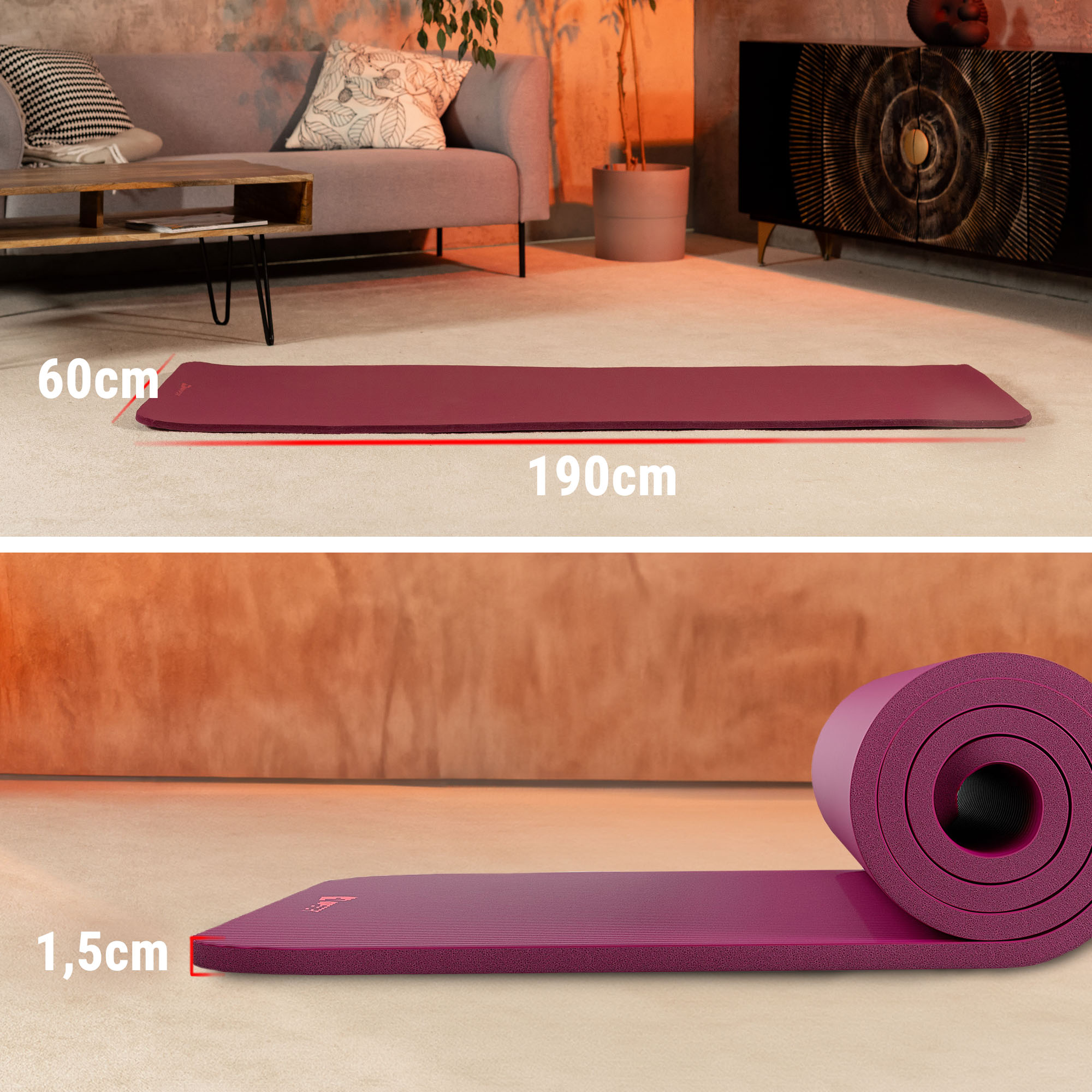 Tappetino NBR amaranto antiscivolo e resistente da 1,5 cm del marchio Hop-Sport. Le dimensioni maggiori garantiscono comfort e comodità durante gli esercizi.