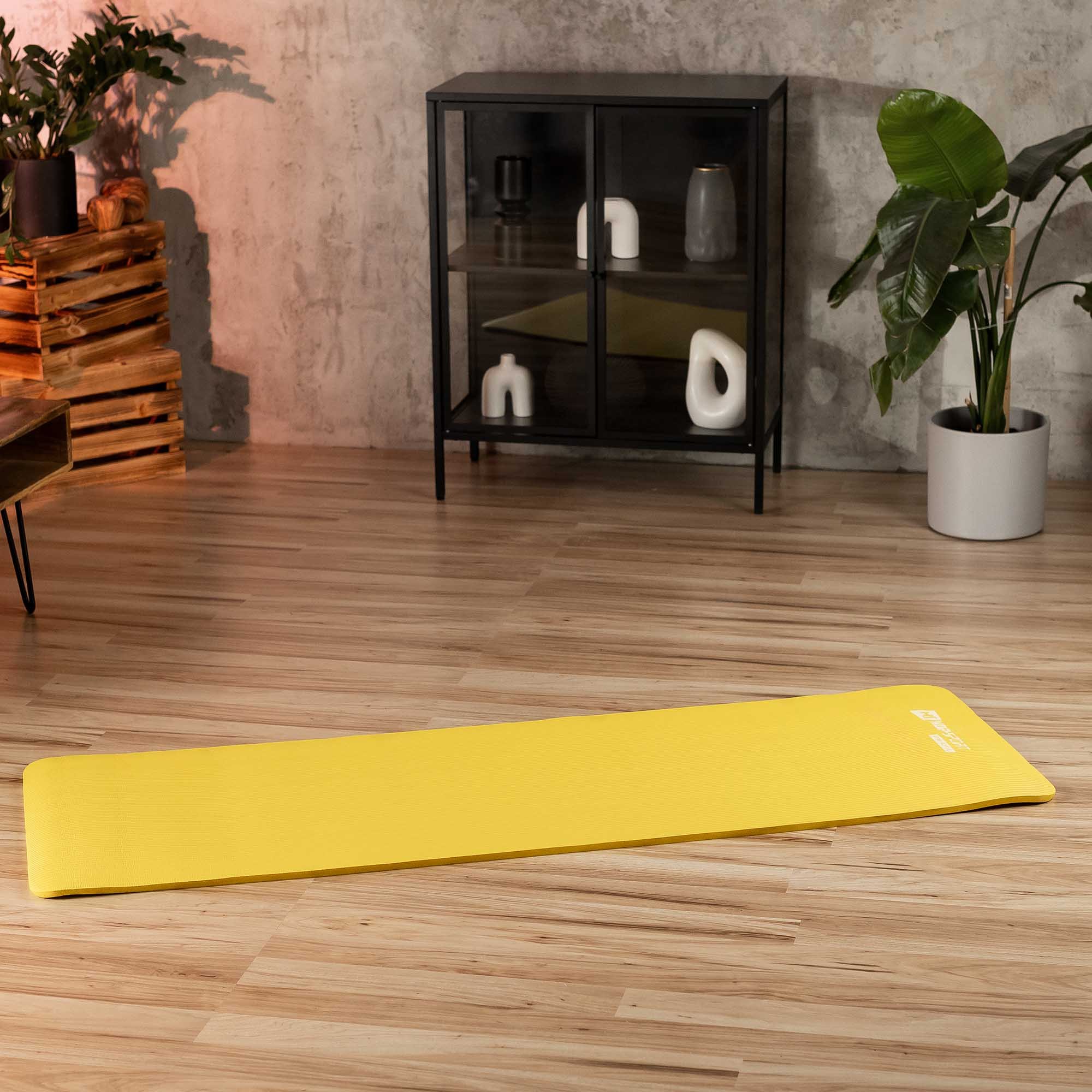 Tapettino per fitness, yoga o pilates, con cinghia di trasporto ed antiscivolo. Tapettino per esercizi a casa o palestra. Comodo e spesso tappetino giallo da 1,5 cm con maniglia per il trasporto, realizzato in schiuma NBR elastica e resistente, che non assorbe il sudore.