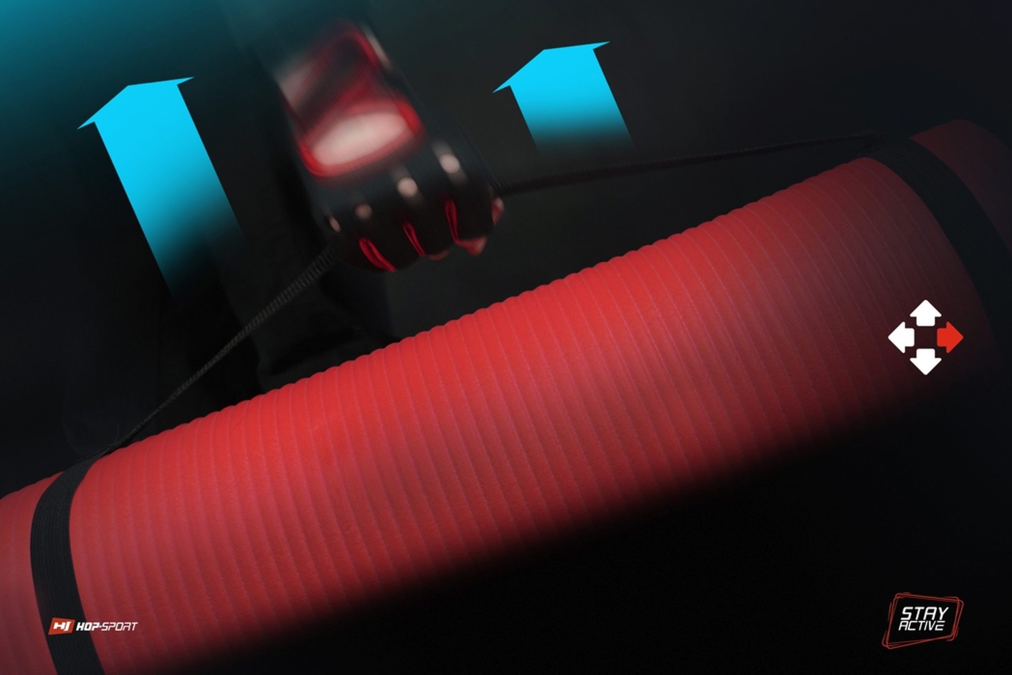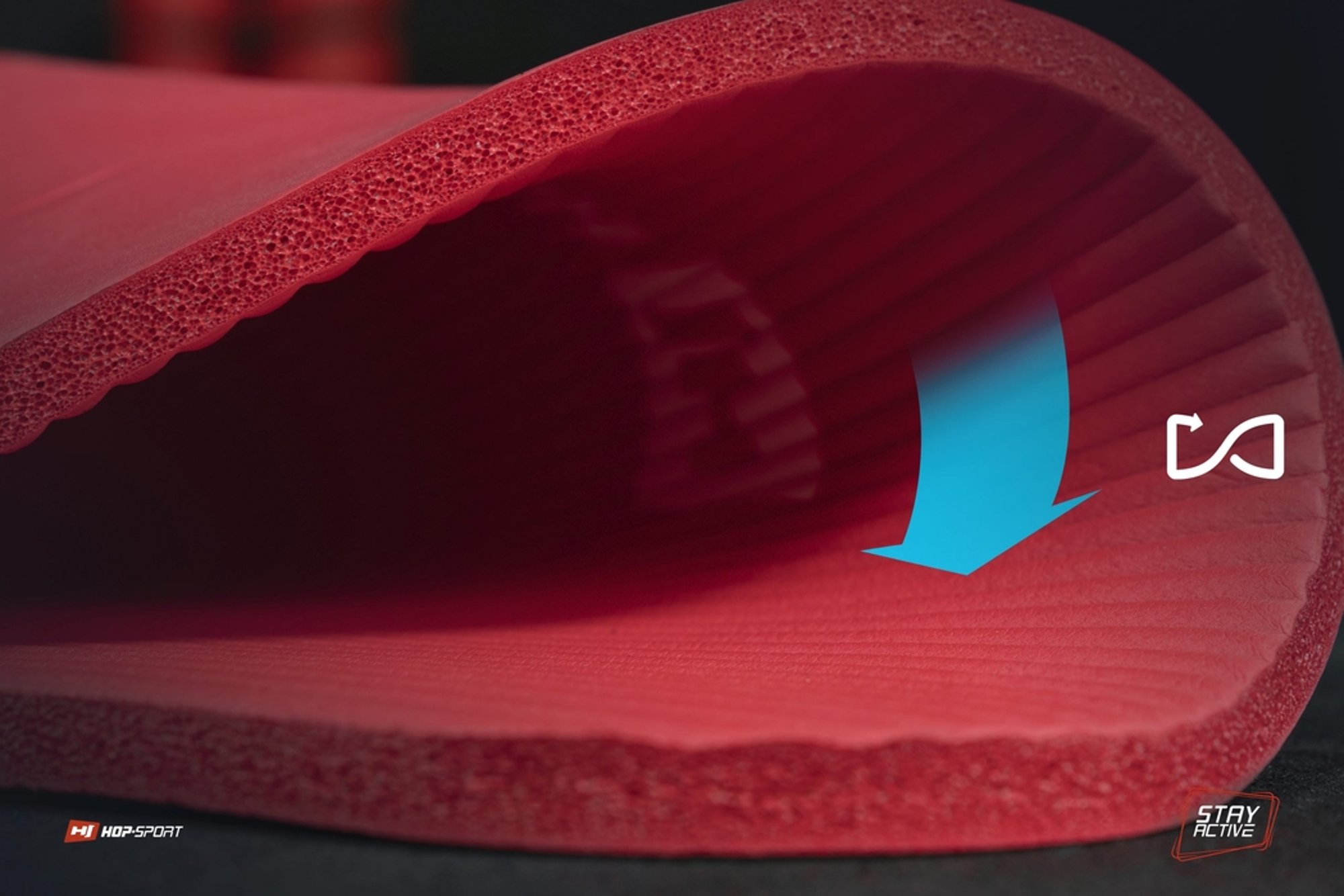 La realizzazione in schiuma NBR rende il tappetino Hop-Sport molto flessibile e resistente . Anche se viene arrotolato quotidianamente per il trasporto o lo stoccaggio, il tappetino non si deforma e, una volta disteso, mantiene sempre un alto grado di elasticità e flessibilità. Inoltre, è antiscivolo – non si sposta durante l'esecuzione degli esercizi.