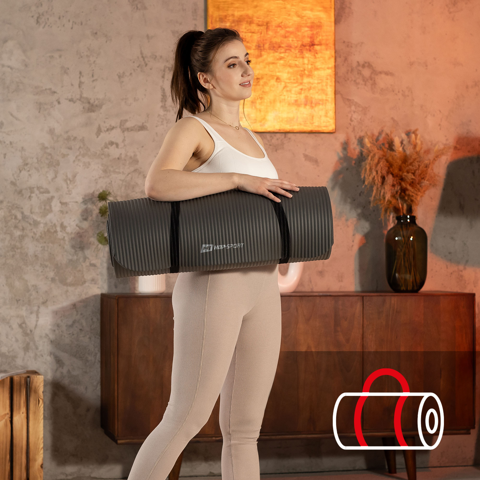 Puoi portare comodamente il tappetino Hop-Sport con te alle lezioni di yoga, fitness, al parco o in spiaggia. Non hai bisogno di una borsa speciale o di una custodia. Insieme al tappetino NBR 1 cm riceverai una cinghia di trasporto, che ti faciliterà il trasporto ovunque tu ne abbia bisogno.