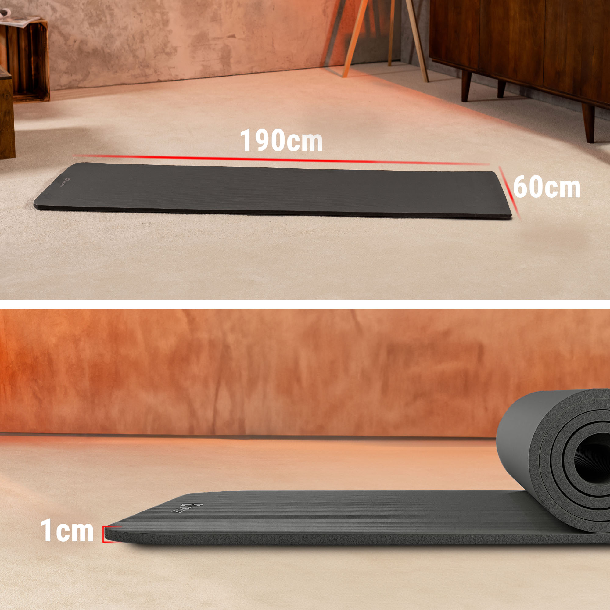 Tappetino NBR grigio antiscivolo e resistente di 1cm di spessore del marchio Hop-Sport. Dimensioni adattate alle esigenze per garantire comfort e comodità durante l'esercizio.