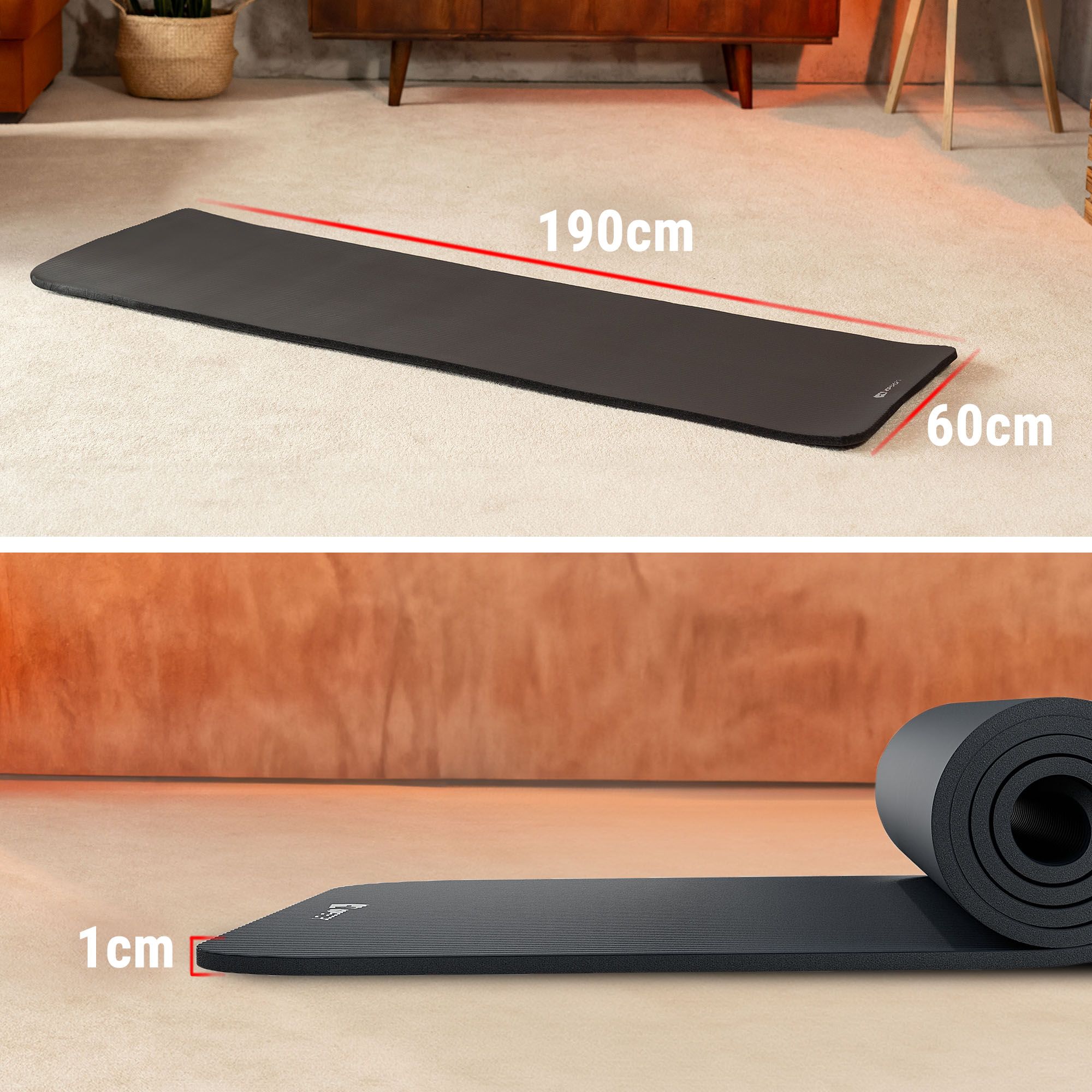 Tapettino per fitness, yoga o pilates, con cinghia di trasporto ed antiscivolo. Tapettino per esercizi a casa o palestra. Tappetino NBR nero antiscivolo e resistente di 1 cm di spessore del marchio Hop-Sport. Dimensioni adattate per garantire comfort e comodità durante l'esercizio.