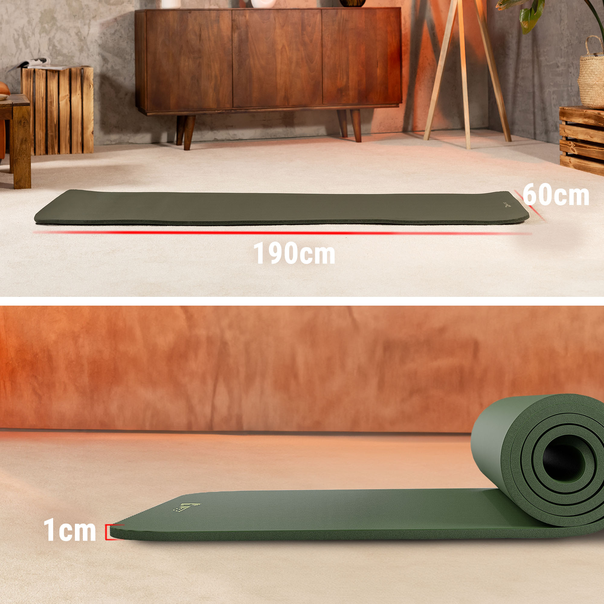 Tapettino per fitness, yoga o pilates, con cinghia di trasporto ed antiscivolo. Tapettino per esercizi a casa o palestra. Tappetino NBR antiscivolo e resistente di colore verde bottiglia con spessore di 1 cm del marchio Hop-Sport. Dimensioni adattate alle esigenze per garantire comfort e comodità durante l'esercizio.