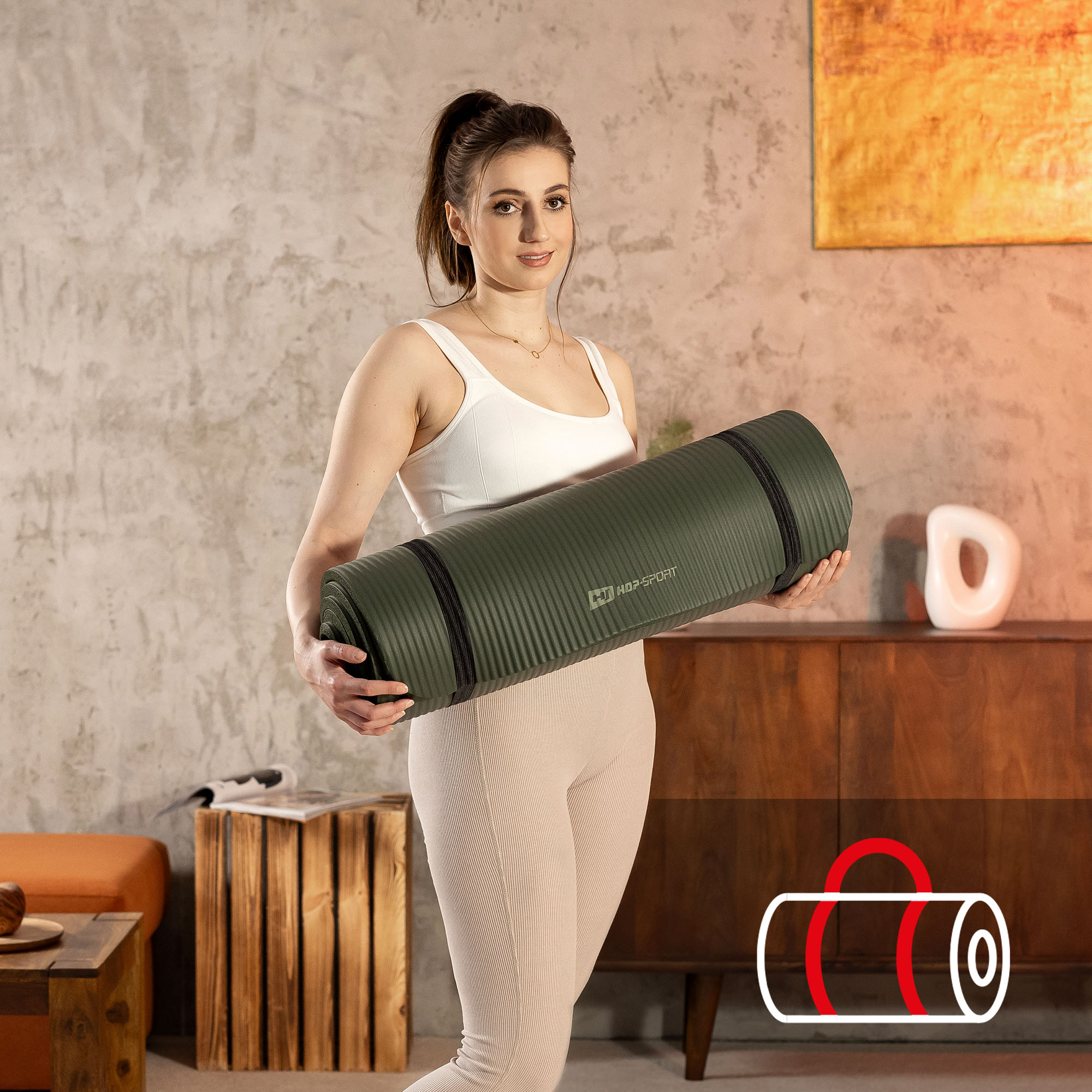 Puoi portare comodamente il tappetino Hop-Sport con te alle lezioni di yoga, fitness, al parco o in spiaggia. Non hai bisogno di una borsa o di una custodia speciale. Insieme al tappetino NBR 1 cm riceverai una cinghia di trasporto, che ti faciliterà nel portarlo ovunque tu abbia bisogno.