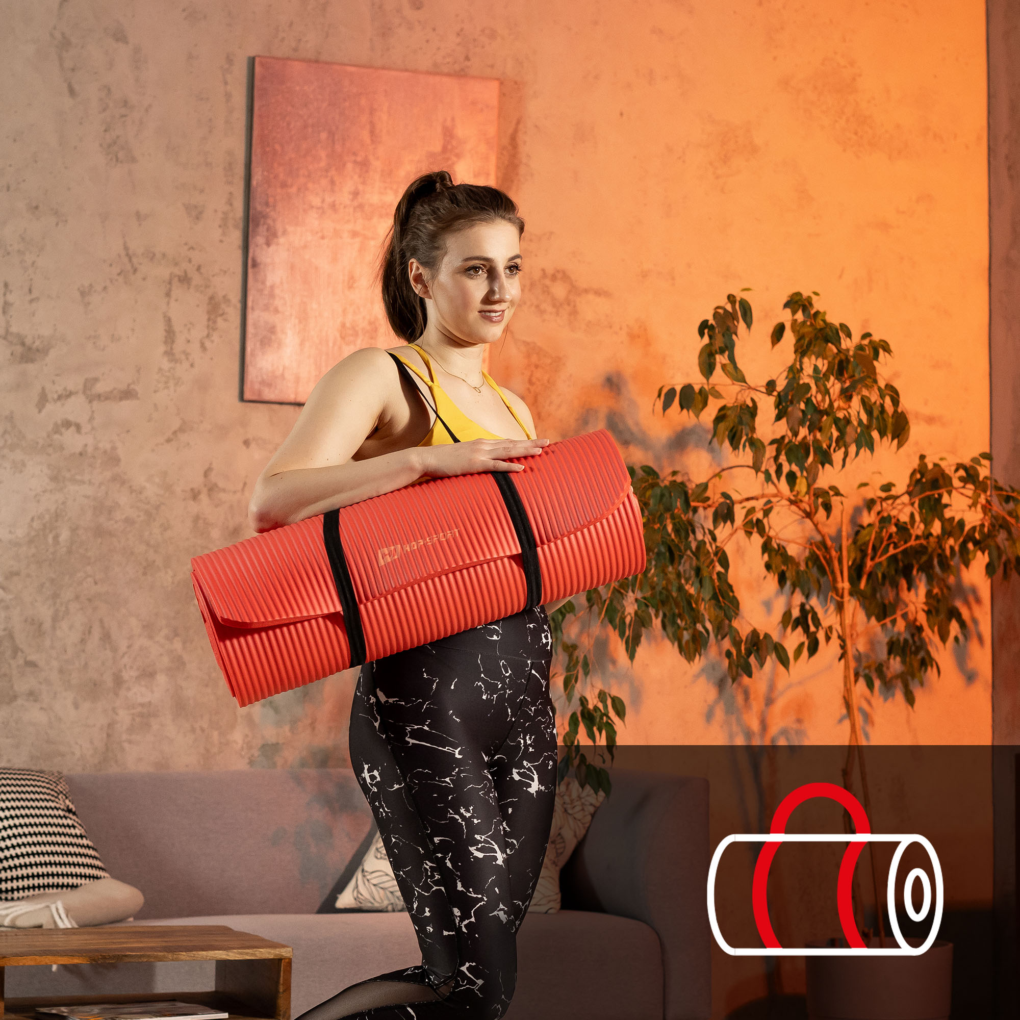 Puoi portare comodamente il tappetino Hop-Sport con te alle lezioni di yoga, fitness, al parco o in spiaggia. Non hai bisogno di una borsa speciale o di una custodia. Insieme al tappetino NBR 2 cm riceverai una cinghia di trasporto, che ti faciliterà il trasporto ovunque tu ne abbia bisogno.