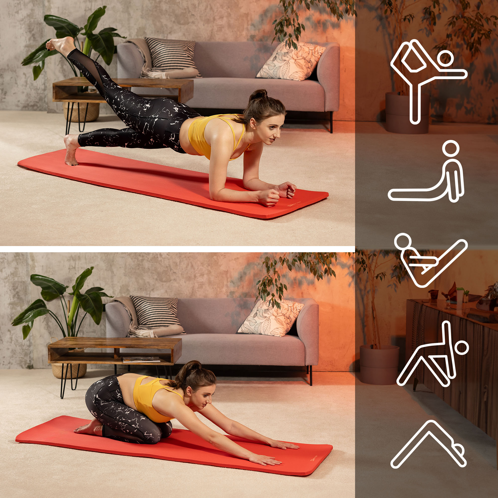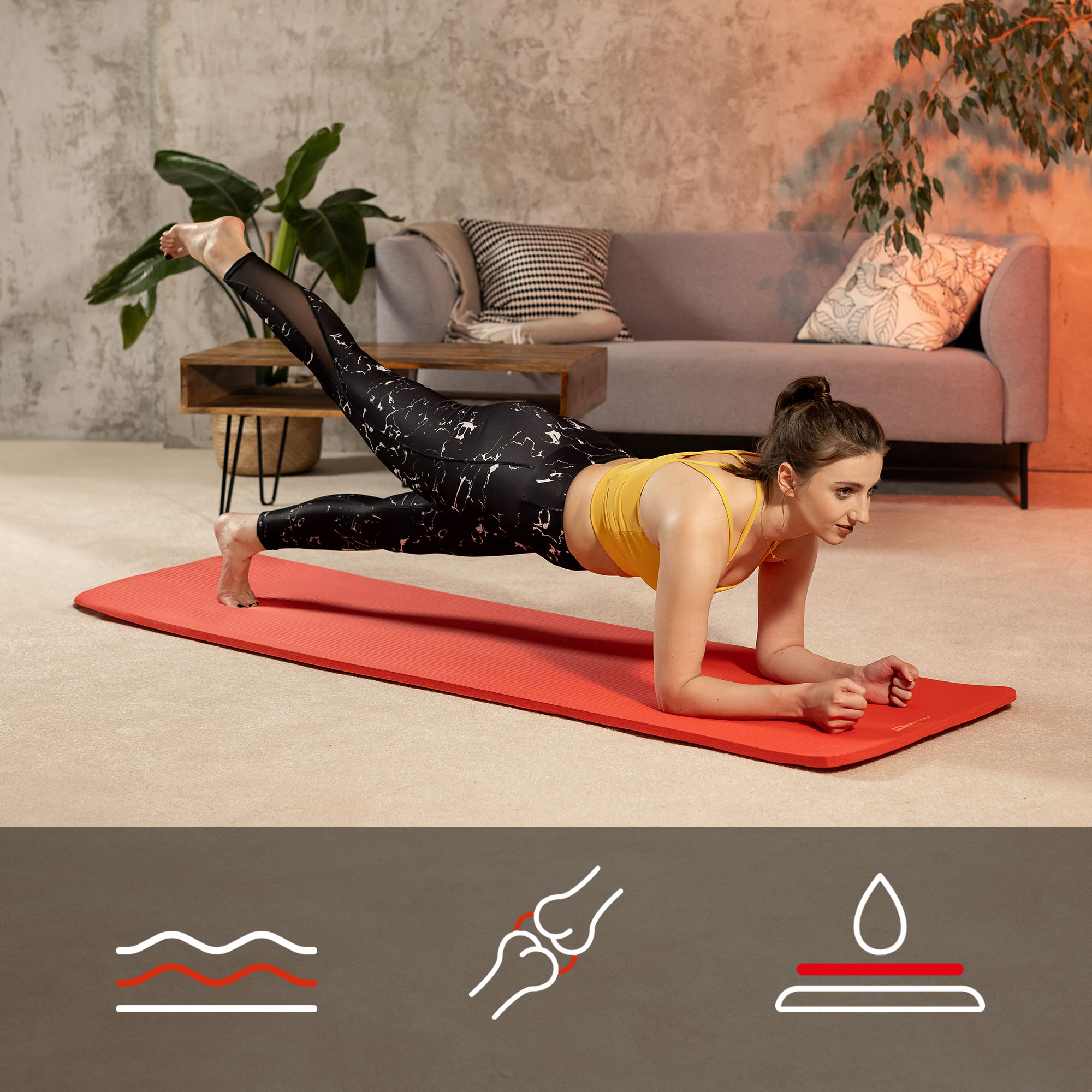 Il tappetino NBR 2 cm protegge efficacemente articolazioni e muscoli durante vari tipi di esercizi. Puoi eseguire sia yoga, pilates, cardio dinamico, che esercizi di forza che generano carichi maggiori e richiedono un'adeguata isolazione e ammortizzazione dal terreno duro. La combinazione di spessore di 2 cm con dimensioni maggiori del tappetino garantisce comfort e sicurezza per ogni sessione di allenamento. Inoltre, la struttura unica del tappetino garantisce un'ottima aderenza, che consente una posizione stabile e l'esecuzione precisa di movimenti complessi durante gli allenamenti di forza.