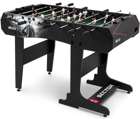 Calcio balilla Sector, grazie alla sua costruzione, si adatta perfettamente durante partite dinamiche. Le gambe larghe del tavolo aumentano la stabilità del calcio balilla. I piedini livellanti posti sotto le gambe del tavolo permettono di adattare efficacemente il tavolo al terreno. È possibile piegare il tavolo in modo che durante le pause non occupi spazio.