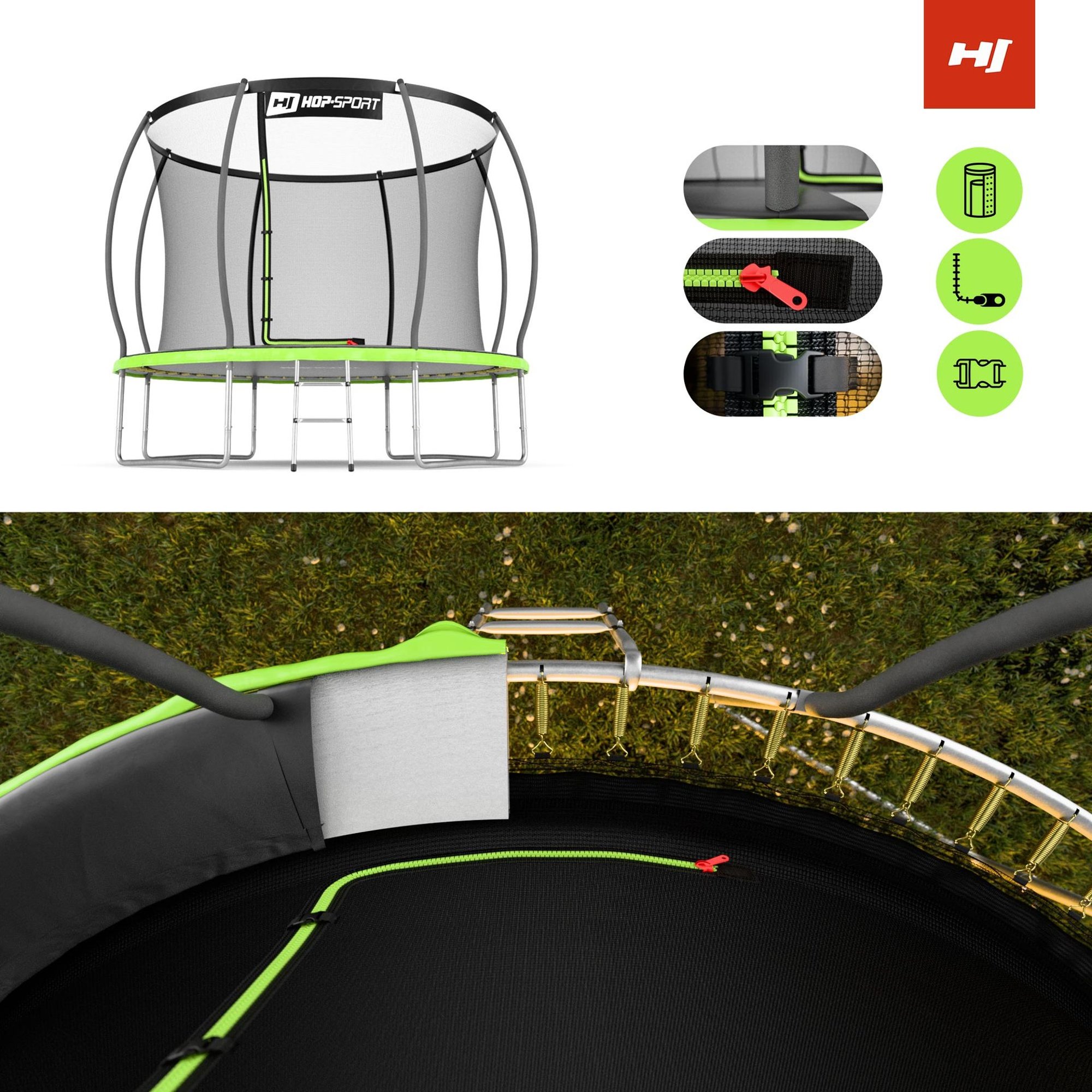 Vuoi garantire a te e alla tua famiglia un divertimento indimenticabile all'aria aperta? Il trampolino da giardino HS-PT10I del marchio Hop-Sport è una scelta eccellente! Grazie alla alta qualità della realizzazione, alla struttura solida e alle numerose protezioni, puoi goderti salti spensierati in condizioni completamente confortevoli e sicure. Questo modello si distingue per il design accattivante e la rete interna innovativa tipo "pumpkin", che garantisce un maggiore comfort nell'uso del trampolino.