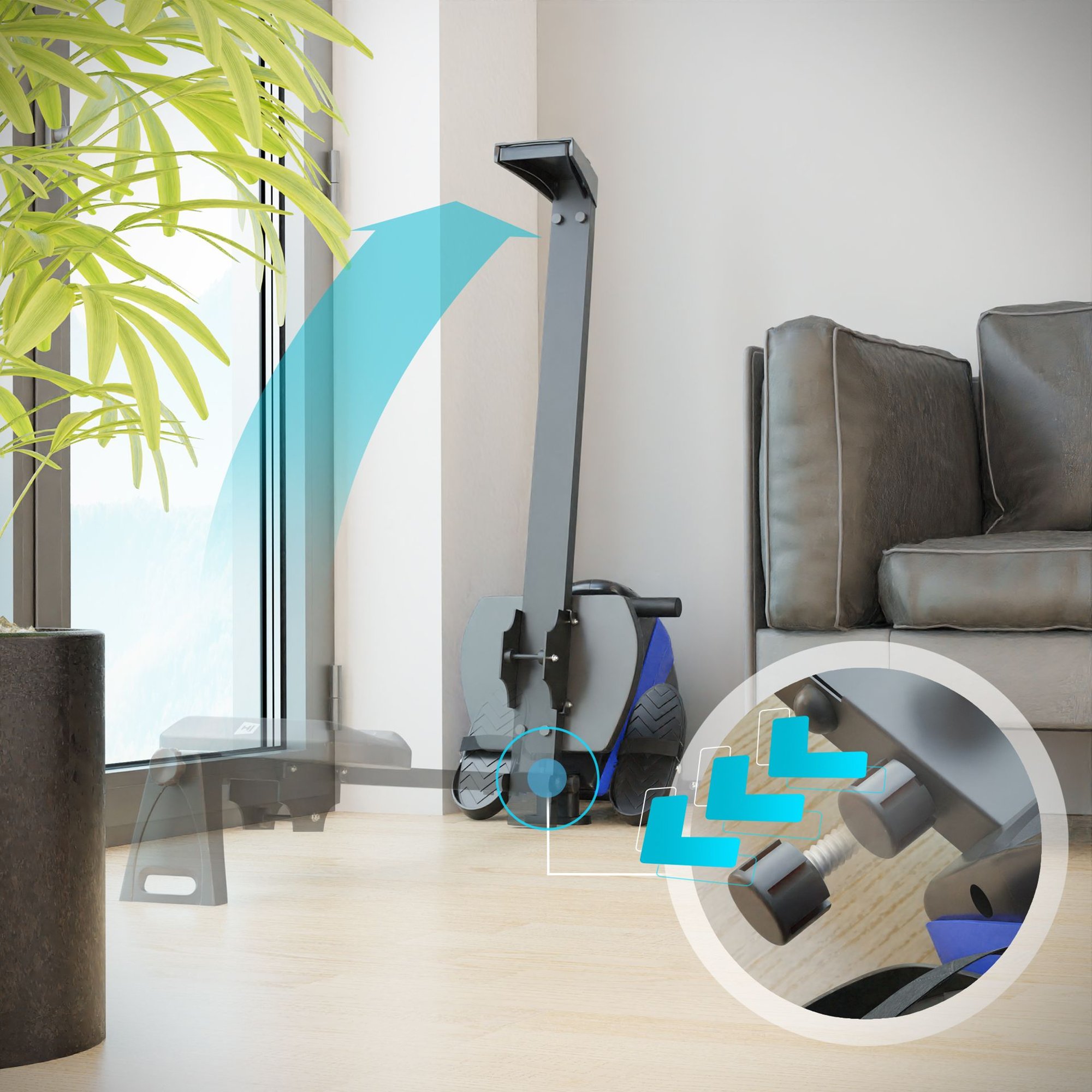 Non devi più sollevare l'attrezzatura per riporla dopo l'allenamento. Grazie alle funzionali ruote di trasporto, puoi spostare e riporre comodamente il vogatore , in modo che non occupi spazio nel tuo salotto. Il sistema di piegatura rapida del vogatore consente di piegare facilmente il dispositivo, risparmiando spazio nella stanza.