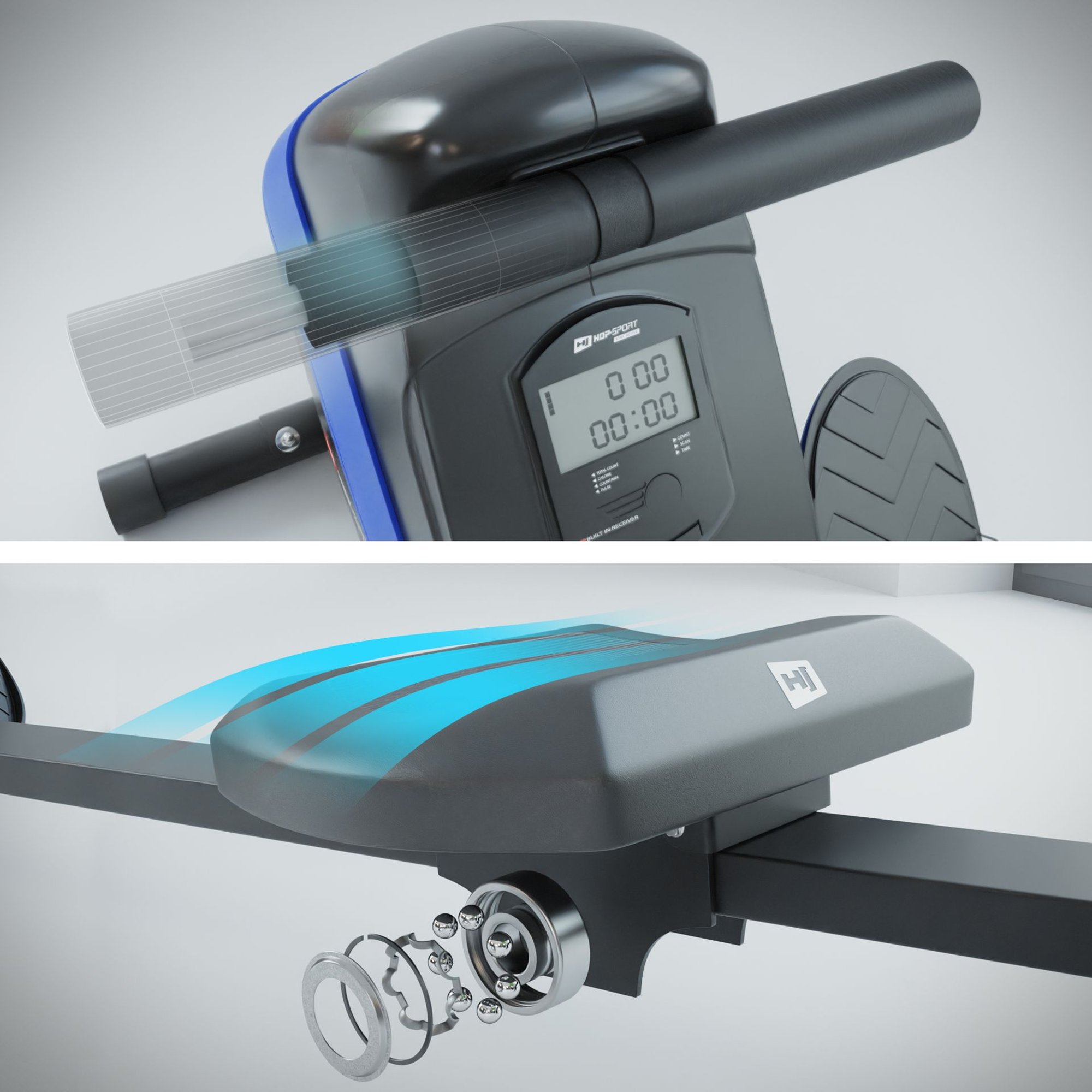 Le impugnature per le mani, rivestite con un rivestimento antiscivolo, prevengono lo scivolamento delle mani durante l'allenamento . Il sedile morbido, anatomicamente sagomato e rivestito in poliuretano, garantisce comfort anche durante un'attività fisica molto intensa. Le dimensioni del sedile assicurano una posizione stabile durante la vogata. Il movimento fluido del sedile lungo la guida è garantito da rulli con cuscinetti.